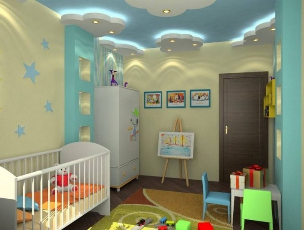 А на этом фото изображен потолок с гипсокартонными элементами. За счет подсветки дизайн выглядит по-детски, очень мило.