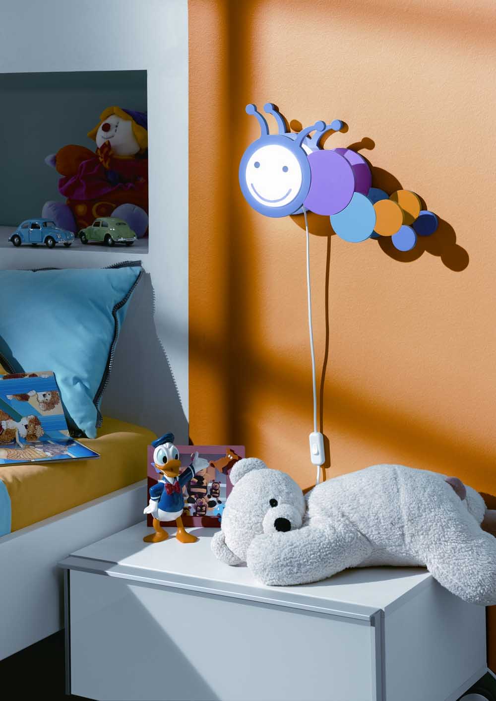 Выбор освещения для детской комнаты непрост, потому что светильники должны быть функциональными и в то же время иметь сказочный характер. Детские ночники могут иметь разные формы и цвета. Около кроватки могут появиться настенные энергосберегающие лампы, которые излучают мягкий свет. Они могут быть в форме облака, плюшевого мишки или супергероя и, таким образом, оказывая успокаивающее действие на спящего малыша.