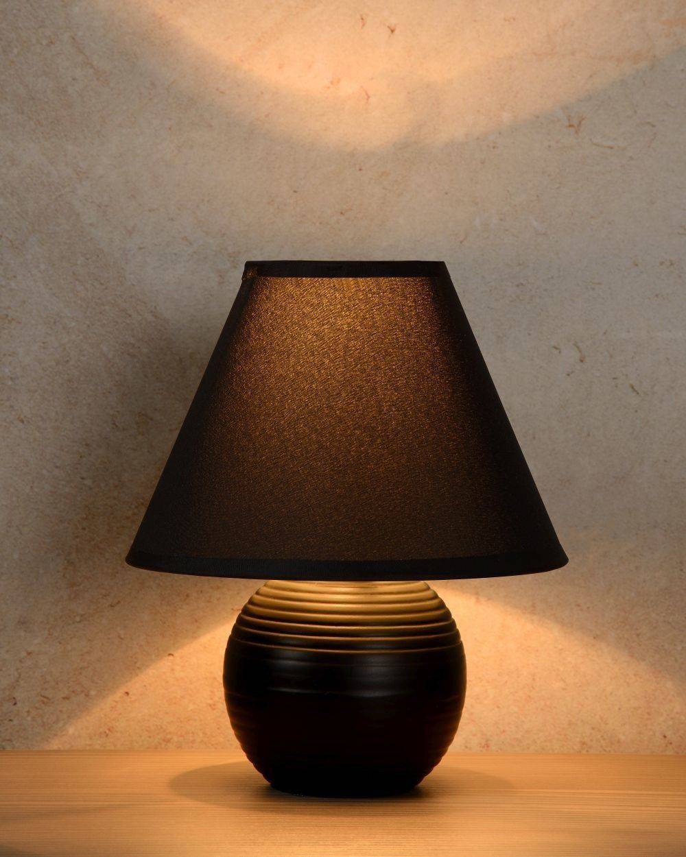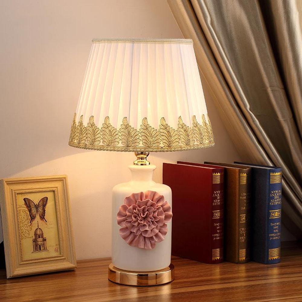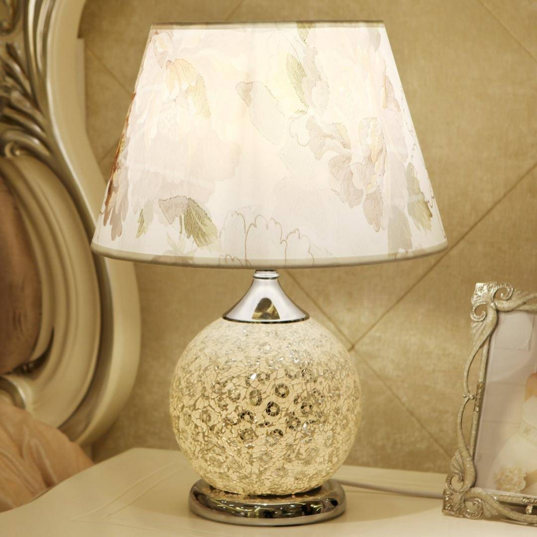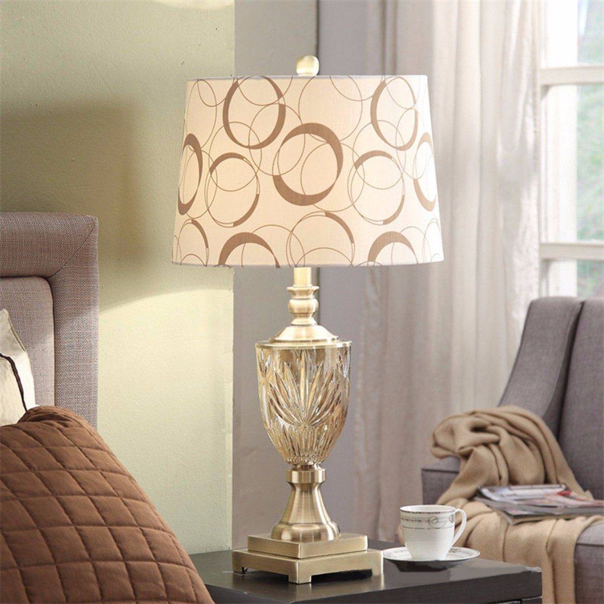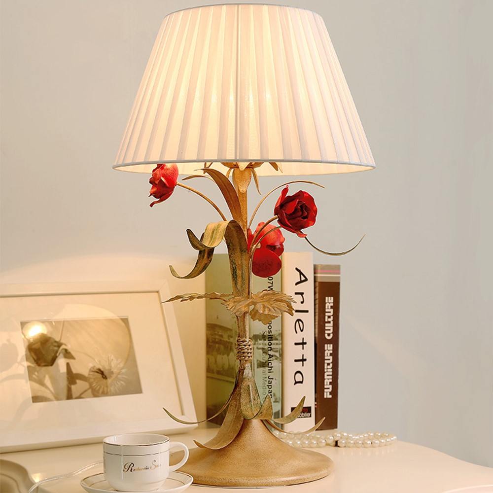 Традиционно в комнатах данного стиля используют прикроватные лампы с абажуром. Дизайнеры предлагают большое разнообразие цвета, форм и материалов как абажура, так и ножек ночников. В комнате с большой деревянной кроватью удачно разместятся лампы с массивным резным основанием из дерева с абажуром конической или трапециевидной формы.