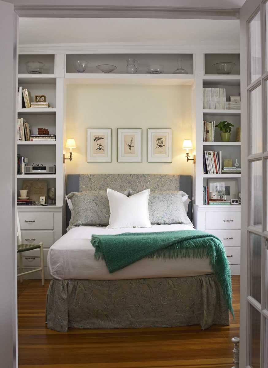 - Мебель для спальни должна иметь компактные размеры, но в то же время, иметь достаточно вместительные зоны хранения. Например, организованная в стенной нише гардеробная или небольшой подвесной комод существенно увеличивают доступную площадь для белья, полотенец, личных вещей, предметов гигиены, канцелярских принадлежностей.