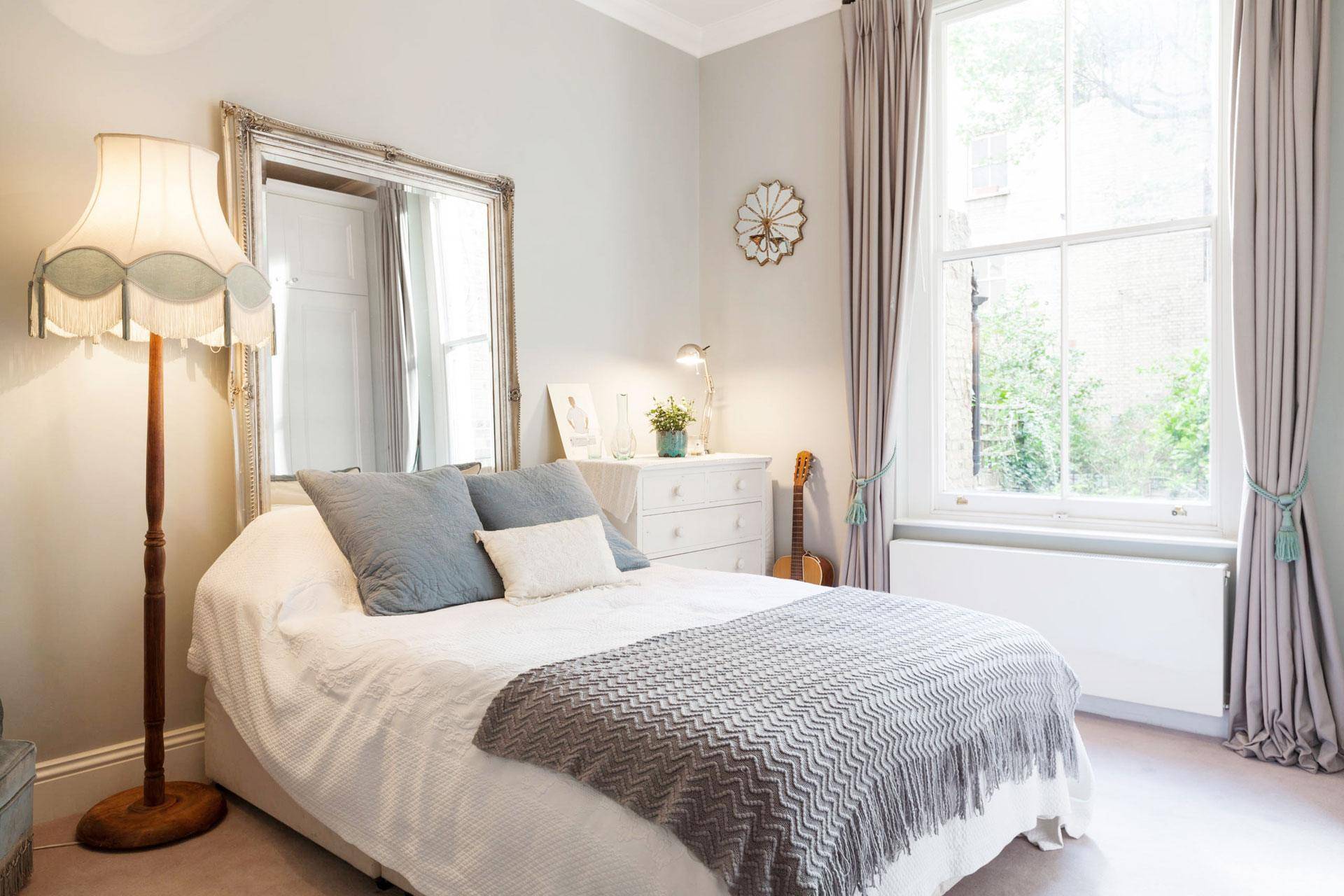 Небольшие спальни больше порадуются лаконичным формам штор и цветам, довольно близко повторяющих цветовую гамму стен.