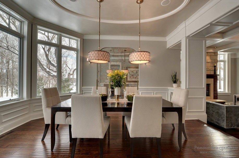 Потолочный светильник. Подходит для обеденного гарнитура любых размеров и пропорций. Если стол круглый или квадратный, выбирают один плафон. Над вытянутым столом красивый вид будет у композиции из двух-трёх ламп.