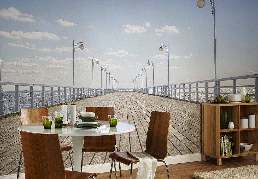 Если вернуться в 70-е и 80-е годы, то можно наблюдать повсеместное использование с интерьерах фотообои. Кухни были украшены лазурными береговыми линиями, пальмами и водопадами. 90-е годы поменяли взгляд на домашний интерьер. Красочные украшения этого типа стали синонимом китча. В настоящее время стильная палитра цветов и передовые технологии фотообоев позволяют вернуться в моду такому типу отделки.