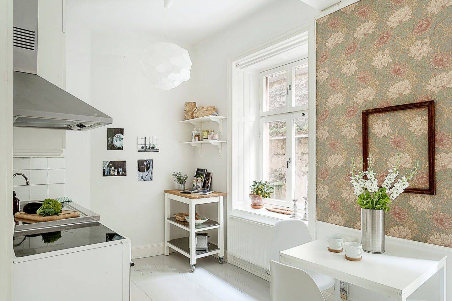 Обои на кухне — отличная идея. Вы можете применить их на всех стенах или в пространстве между шкафами. Посмотрите самое красивое расположение интерьеров кухонь с обоями.