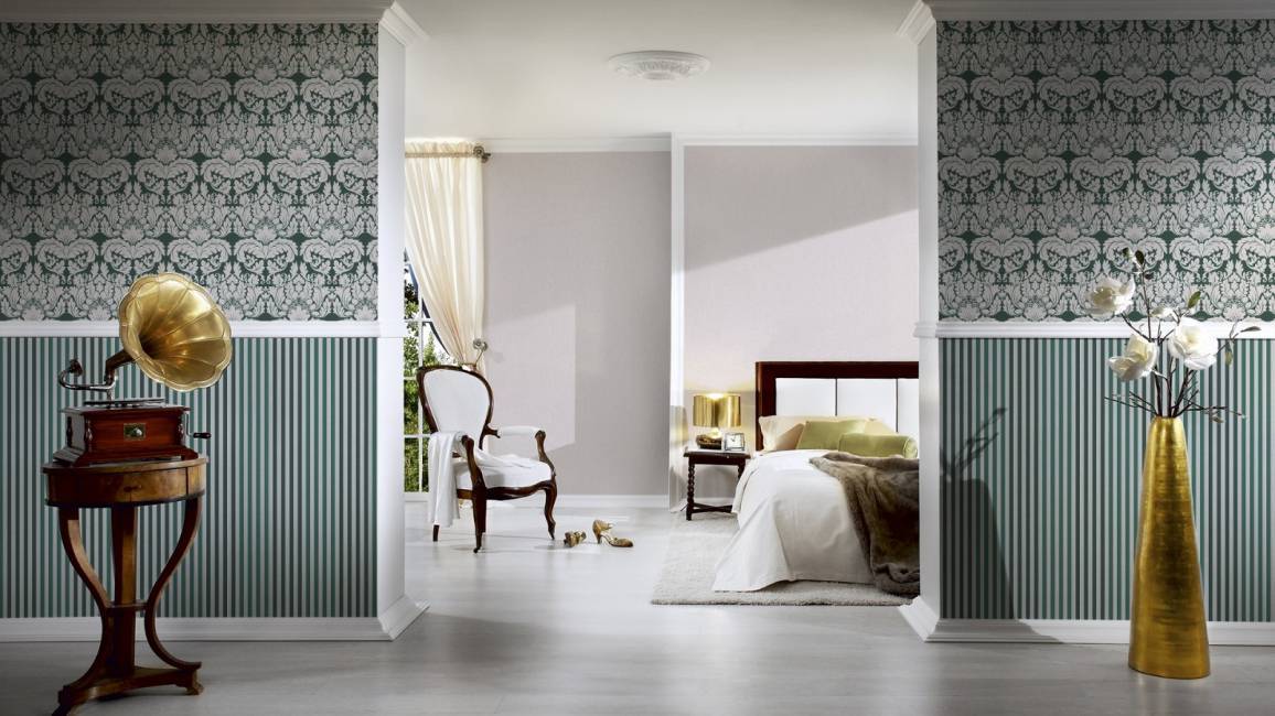 - 1/3 нижней части стены оклеены обоями в мелкий рисунок, сверху однотонные полотна или крупные вензеля;