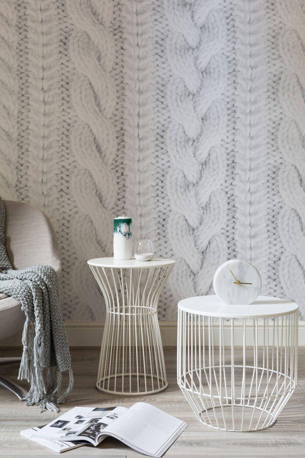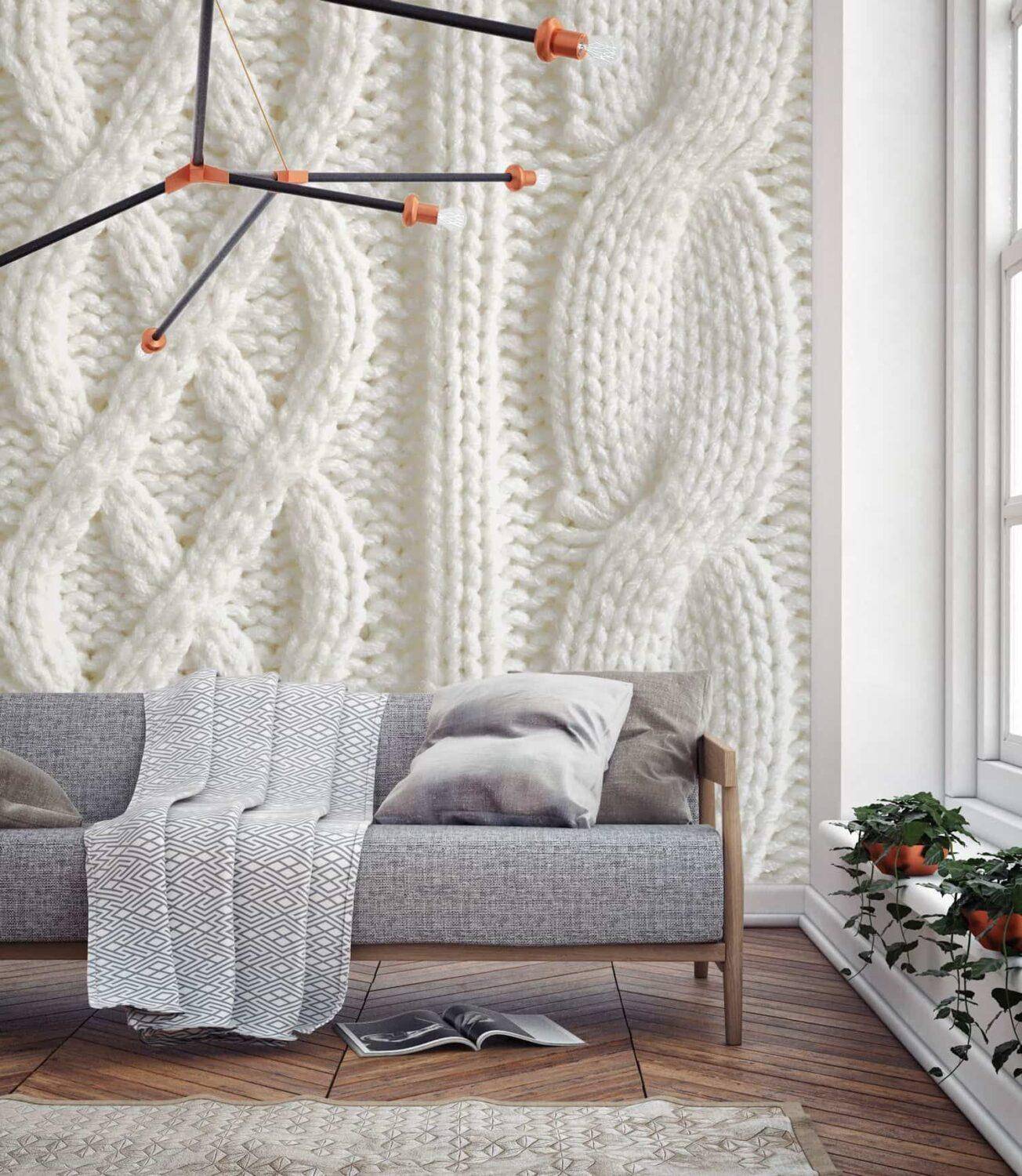 Данный дизайн стильных обоев выглядит немного странно, но при этой достаточно красиво. Он в точности имитирует вязку спицами или крючком, а также смотрится очень стильно и модно. Его очень просто обыграть в интерьере, скажем, тем же пледом на диване, повторяющим способ вязки на обоях. Такое оформление прекрасно подойдет для спален, создавая ощущение уюта и добавляя еще больше тепла в домашний очаг. Такие обои являются разновидностью фотообоев, но выглядят очень реалистично.