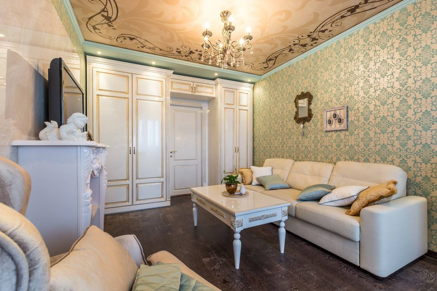 Гостиная смотрится еще торжественнее, если остановить свой выбор на текстильных отделочных материалах из шелка. Они придадут помещению особенный лоск и уместную помпезность и будут интересно сочетаться со шторами.