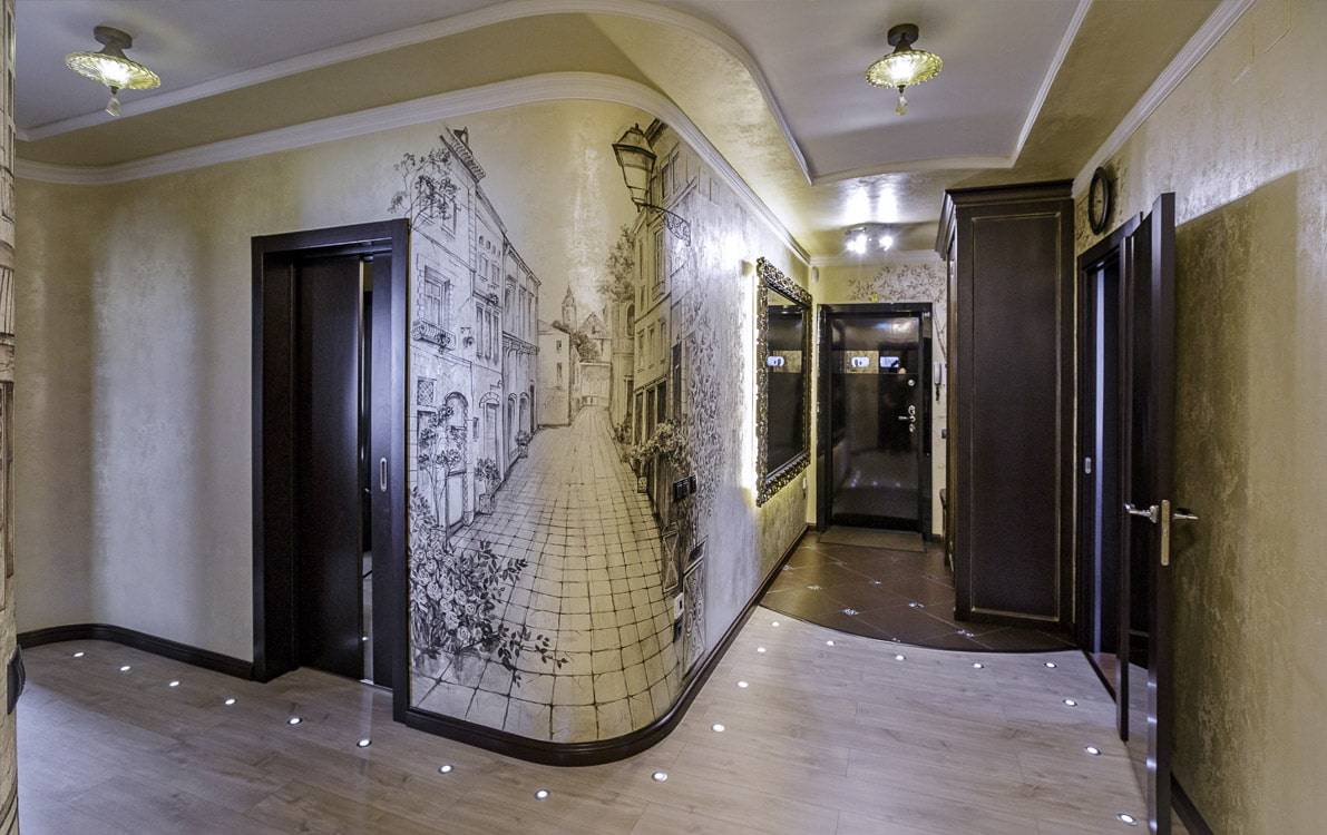Фотообои, широко применимые в современных интерьерах, не всегда будут восприниматься гармонично в маленьких комнатах. Для прихожей лучше выбрать панорамные изображения или небольшие монохромные сюжеты, которые не создадут цветовой дисбаланс.