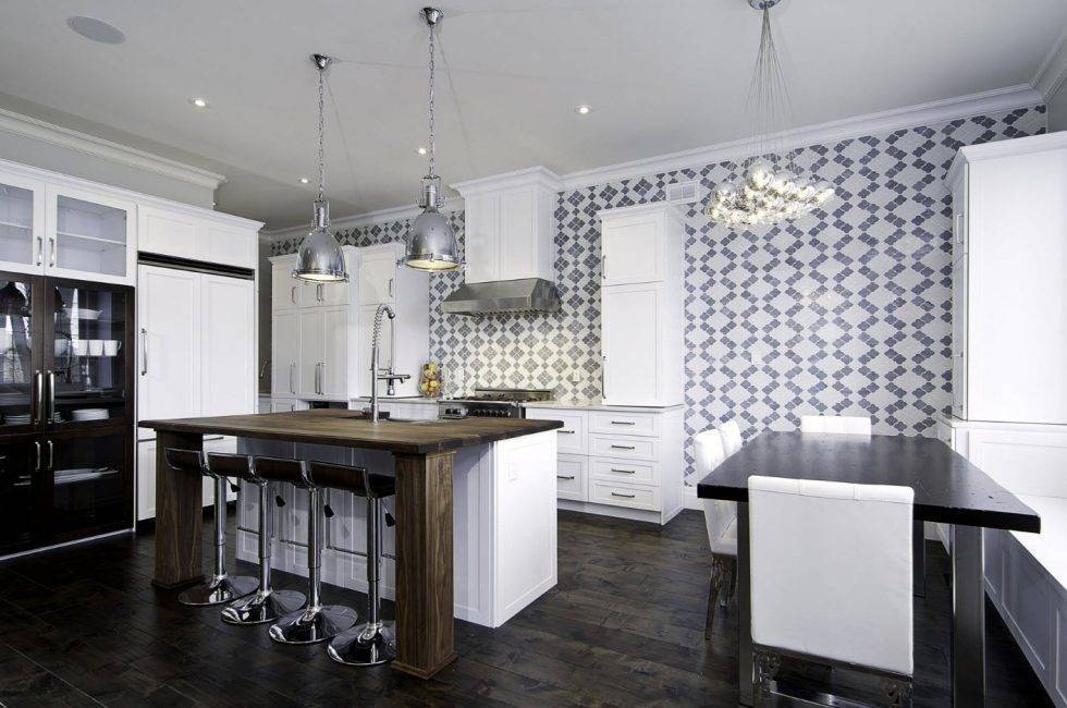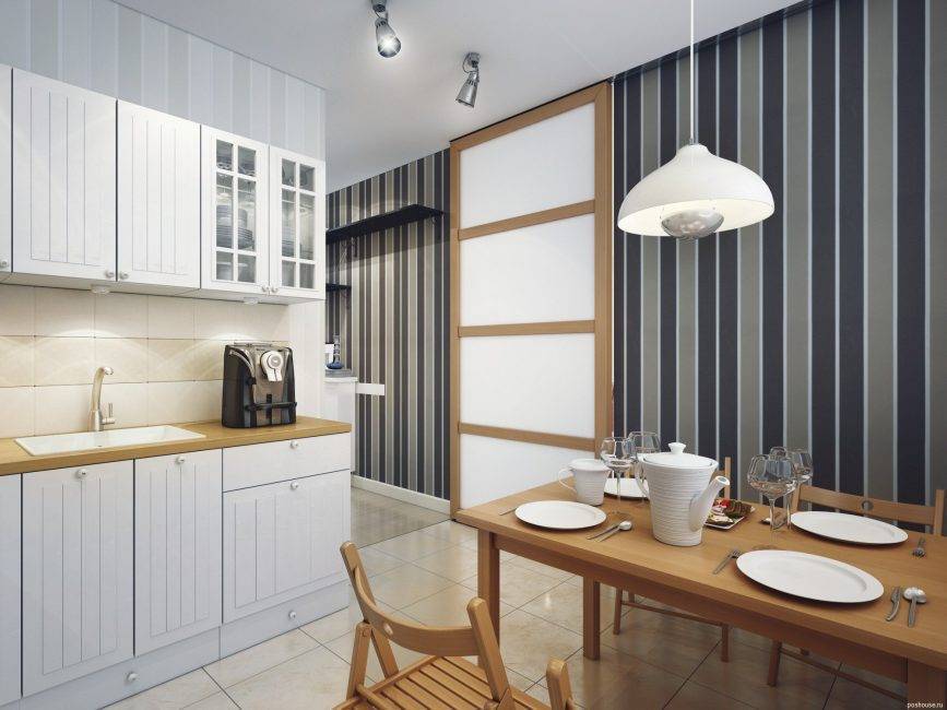 Если в голове никаких особенных мыслей нет, то всегда можно использовать белые обои. Скомбинировать можно белые и темные обои. Белые обои в компактных кухнях — это классика. Белоснежная обстановка делает помещение легким. Можно использовать белый обоев в качестве оттеняющего фона