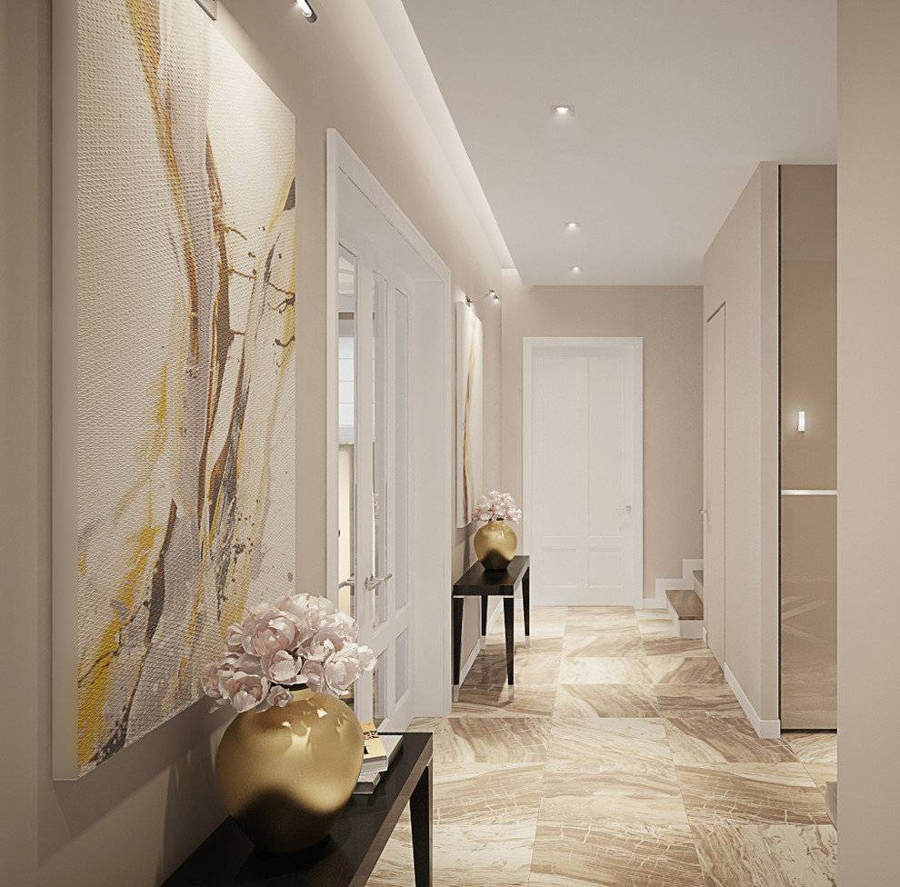 Чаще всего в коридорах используется бежевый цвет. Светлые оттенки помогут зонировать пространство, комбинированные помещения с разной отделкой будут смотреться свежо и оригинально. В современных дизайнерских решениях, например, хай-тек, приветствуется использование серых оттенков, а также смелых кислотных цветов, таких как фиолетовый, салатовый, красный, которые можно сочетать с пастельной гаммой.