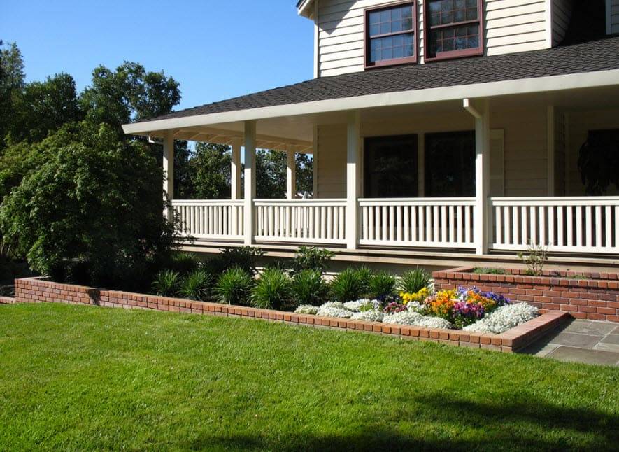 Хорошим украшением участка будет небольшой газон с цветником, разбитыми перед самым домом из многолетних растений между которых можно высадить однолетки. Этим можно добиться беспрерывного цветения.