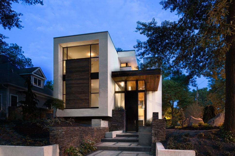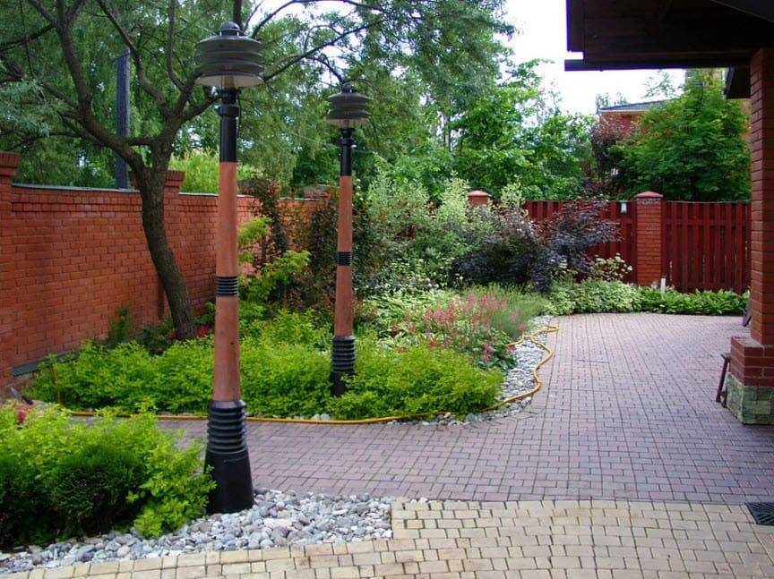 При дефиците свободного места на пространстве между домом и улицей озеленение палисадника ограничивают, высаживая лишь несколько компактных деревьев с аккуратными кронами. Роскошные объемные клумбы в палисаднике ландшафтного дизайна маленького садового участка смотрятся пафосно и неуместно.