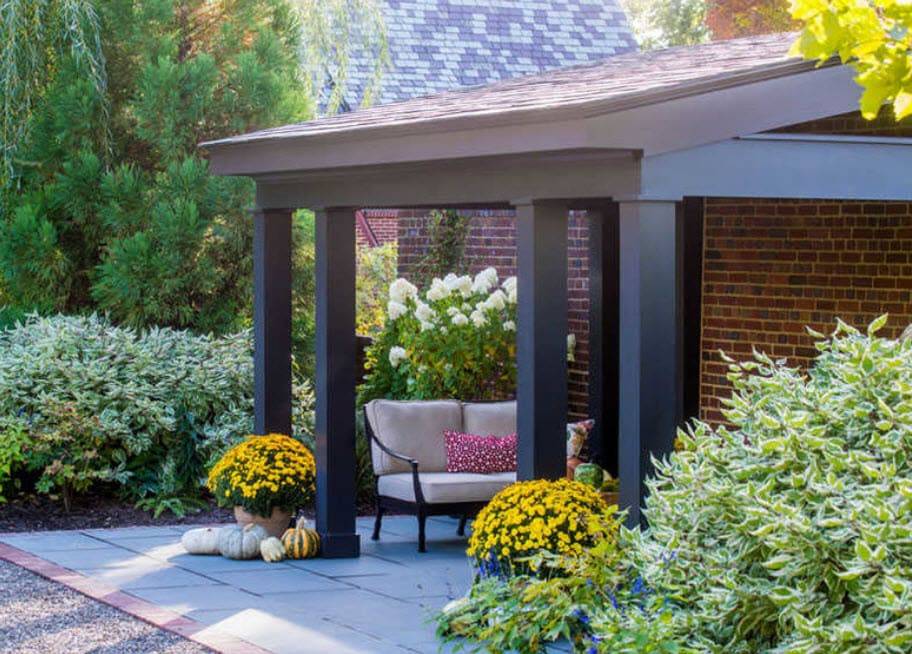 Вполне можно обойтись двумя-тремя декоративными вазонами с контейнерными растениями у ворот или небольшими горшками с цветами на ступенях крыльца, чтобы добавить в композицию ярких красок и придать ей законченный вид. Ландшафтный дизайн садового участка фото: