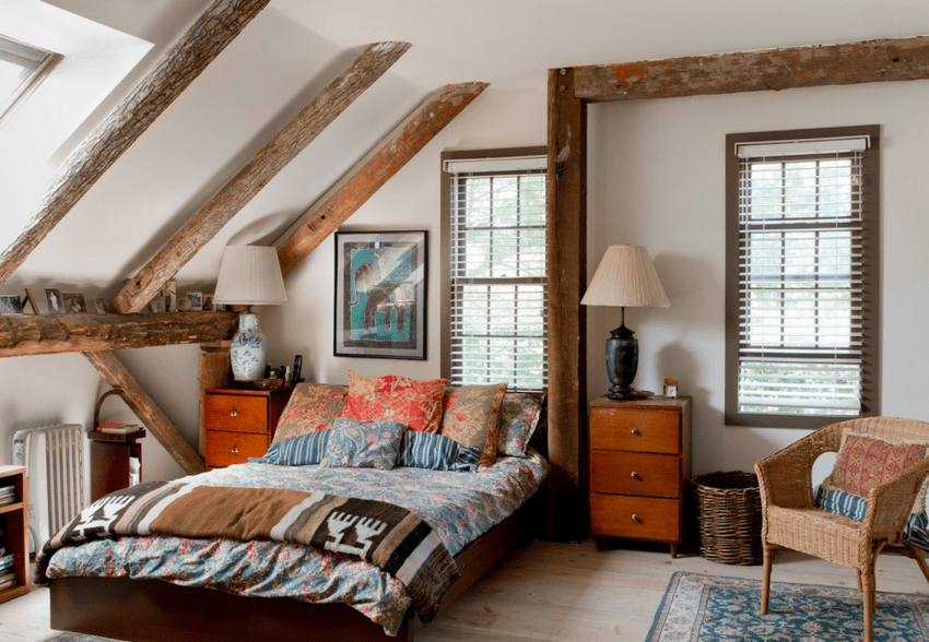 Мебель, в том числе кровать, преимущественно из натуральной древесины, как будто выбеленная на солнце. Стены могут быть однотонными с выраженной фактурой, или гладкими.