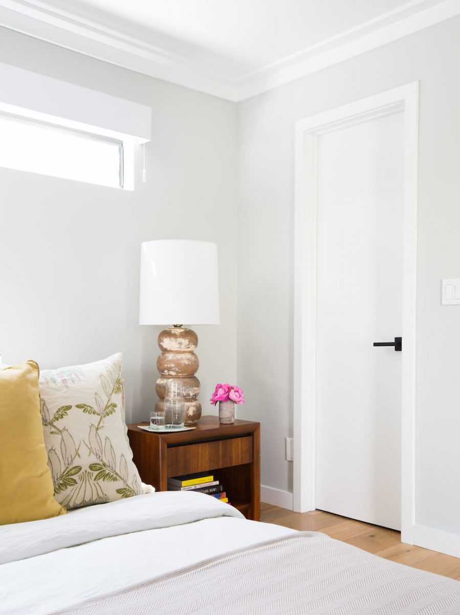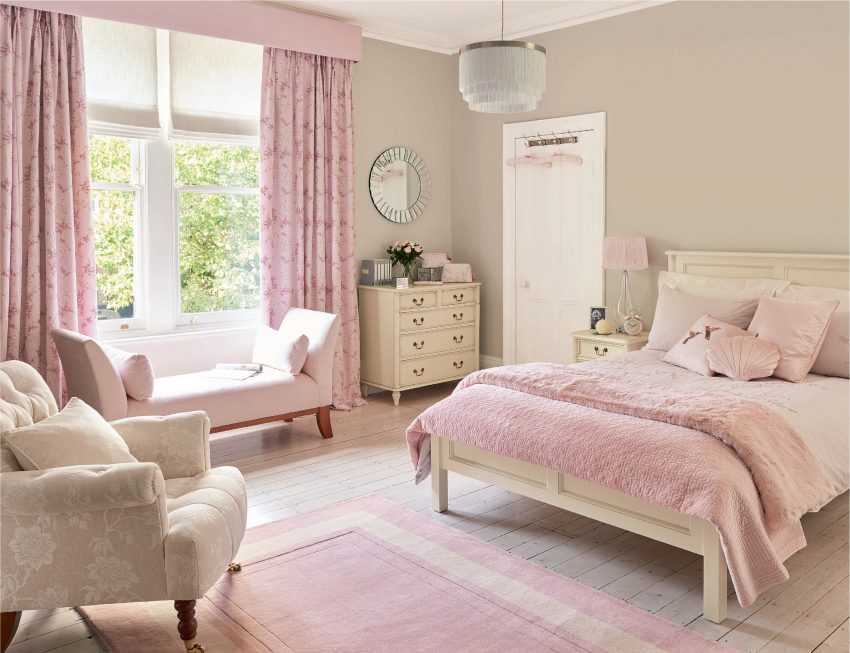 Чисто белый цвет не подходит для спальни на южной стороне – он будет «слепящим» в солнечные летние дни. Подойдет любой холодный оттенок, который смягчит яркие лучи солнечного света. Это размытый мятный или голубой, жемчужно-серый, бледно-розовый или нежно-сиреневый цвет.