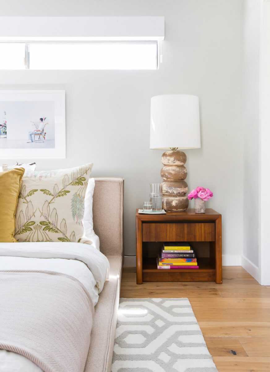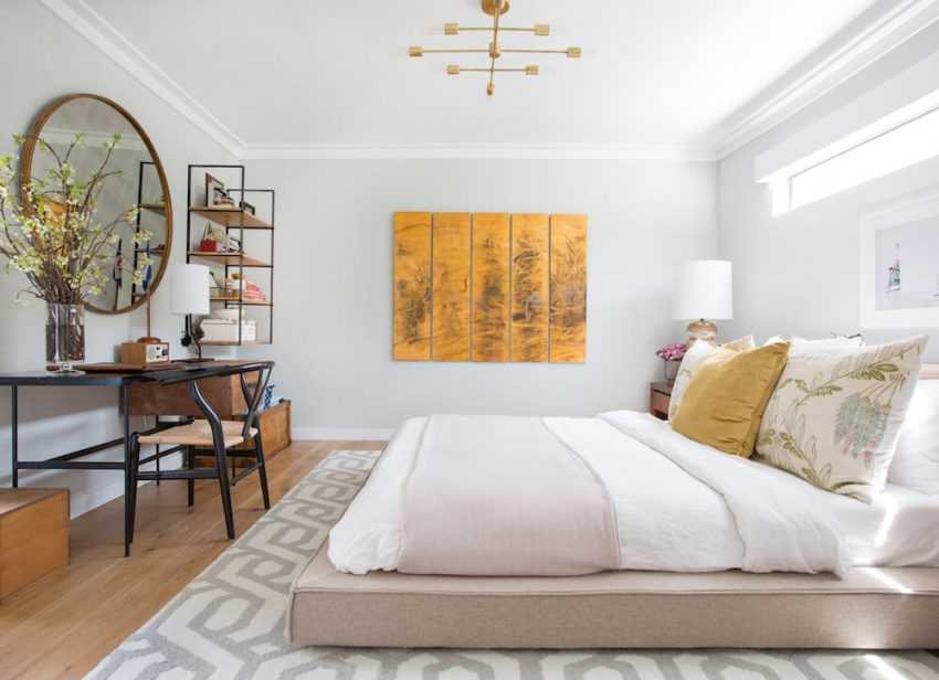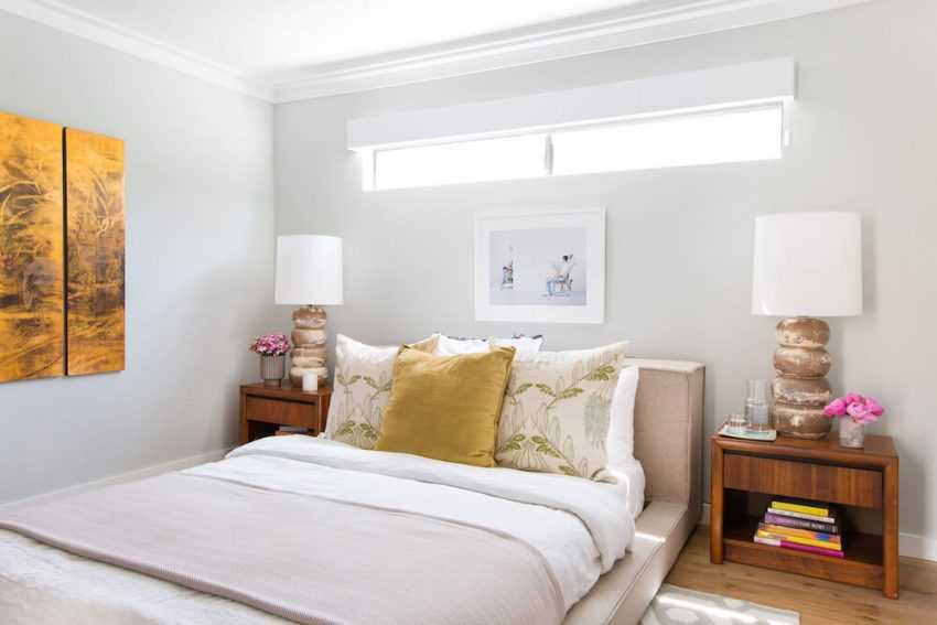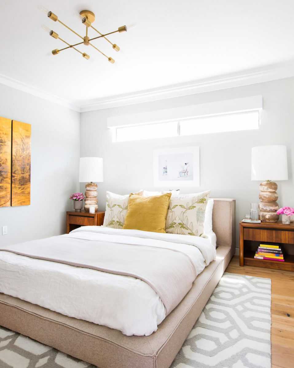 По правилам симметрии в центре комнаты следует поместить кровать, а по бокам одинаковые тумбочки и светильники, настенные светильники также должны быть одинаковыми. При желании, у изголовья кровати можно повесить картину, при этом она должна быть ровно посередине.