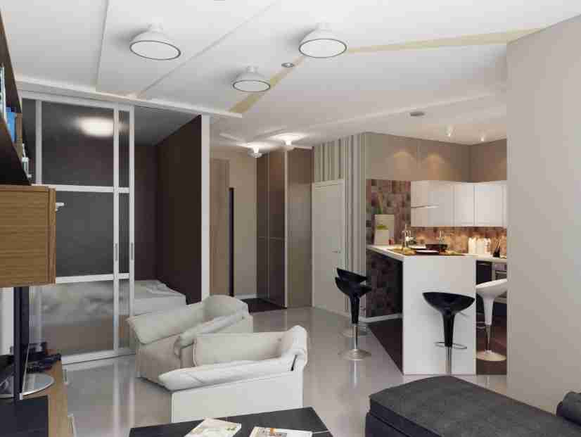 Подвесной потолок из гипсокартона дает возможность сделать разноуровневые конструкцию для дополнительного зонирования объединенного пространства. Другое преимущество – реализация интересных и сложных идей с освещением. Минус этого решения – потеря нескольких сантиментов высоты помещения.