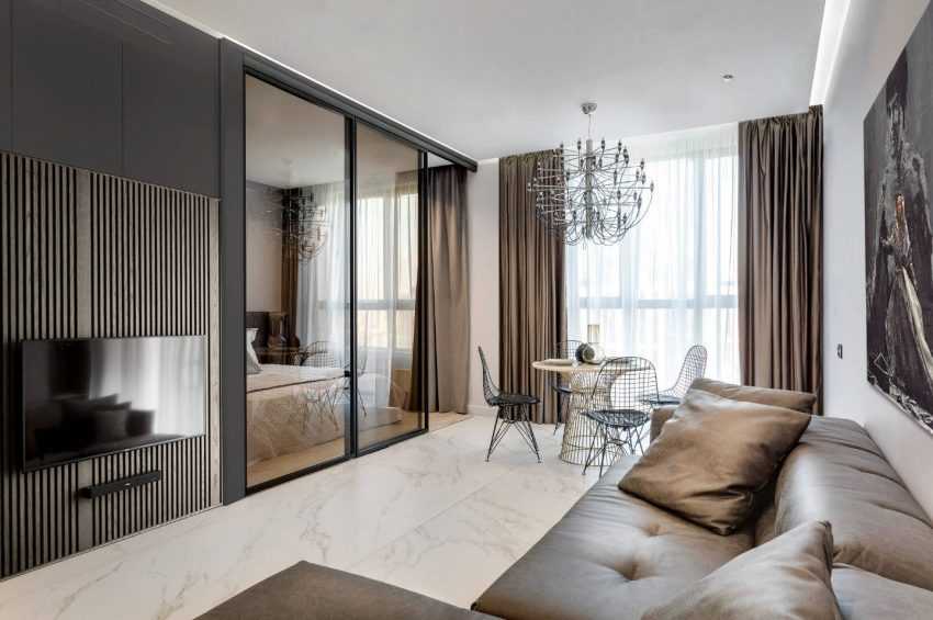 Стиль модерн сейчас очень популярен, так как он совмещает в себе красоту, функциональность и удобство. В нем дизайнеры используют современную трансформирующуюся мебель, много лаконичных и ярких элементов, как встроенная подсветка, многоуровневые потолки и ниши в стенах.