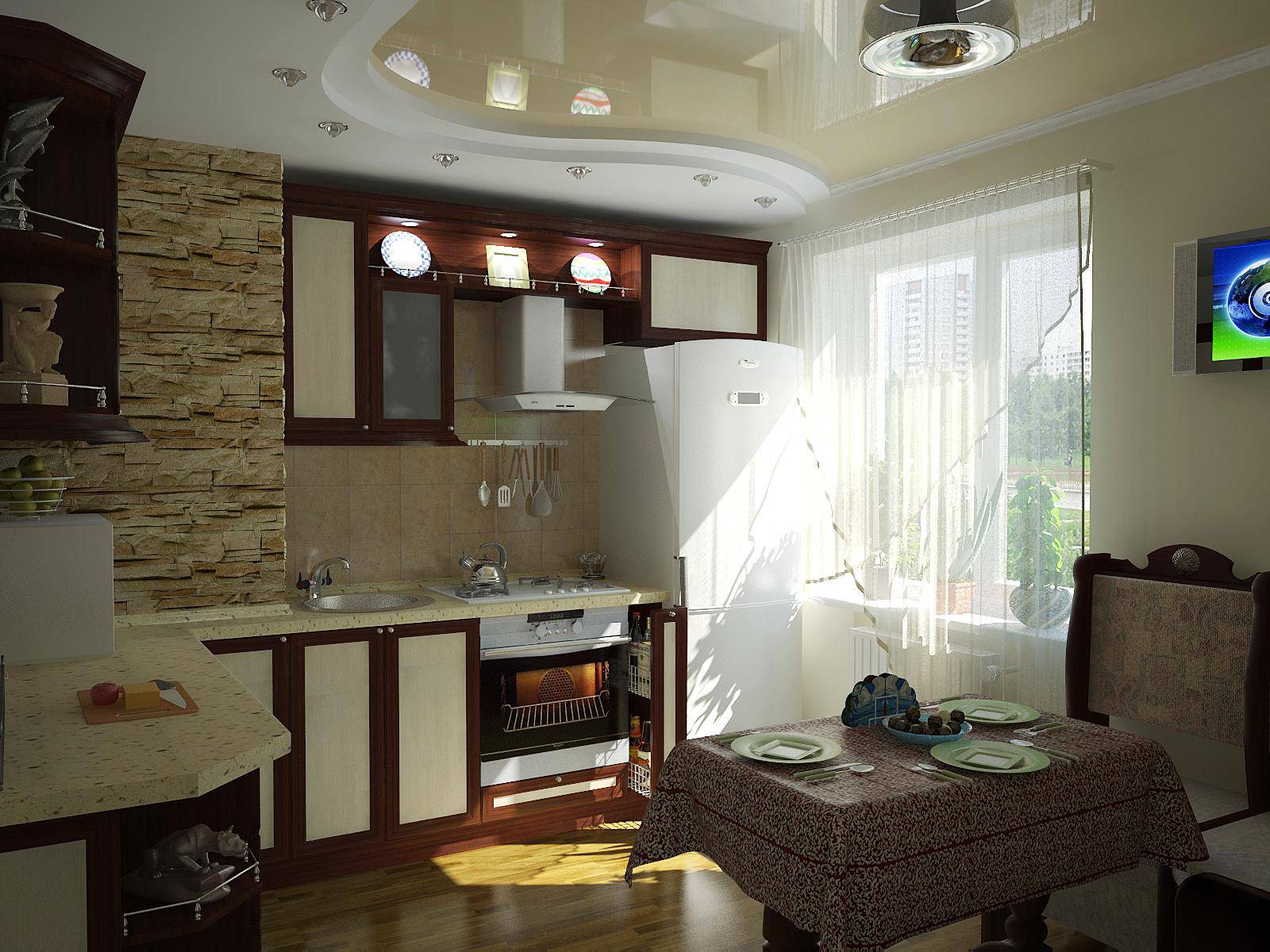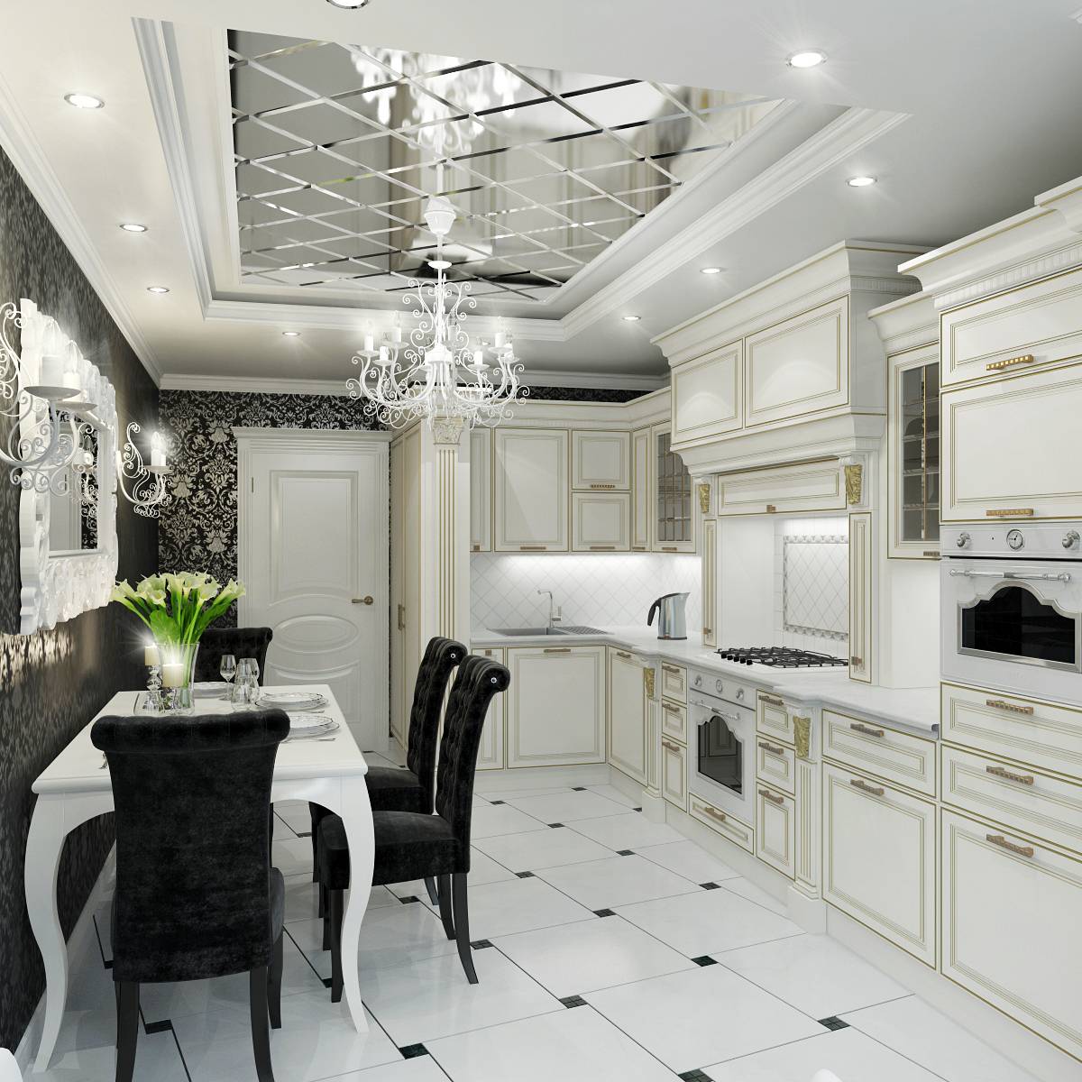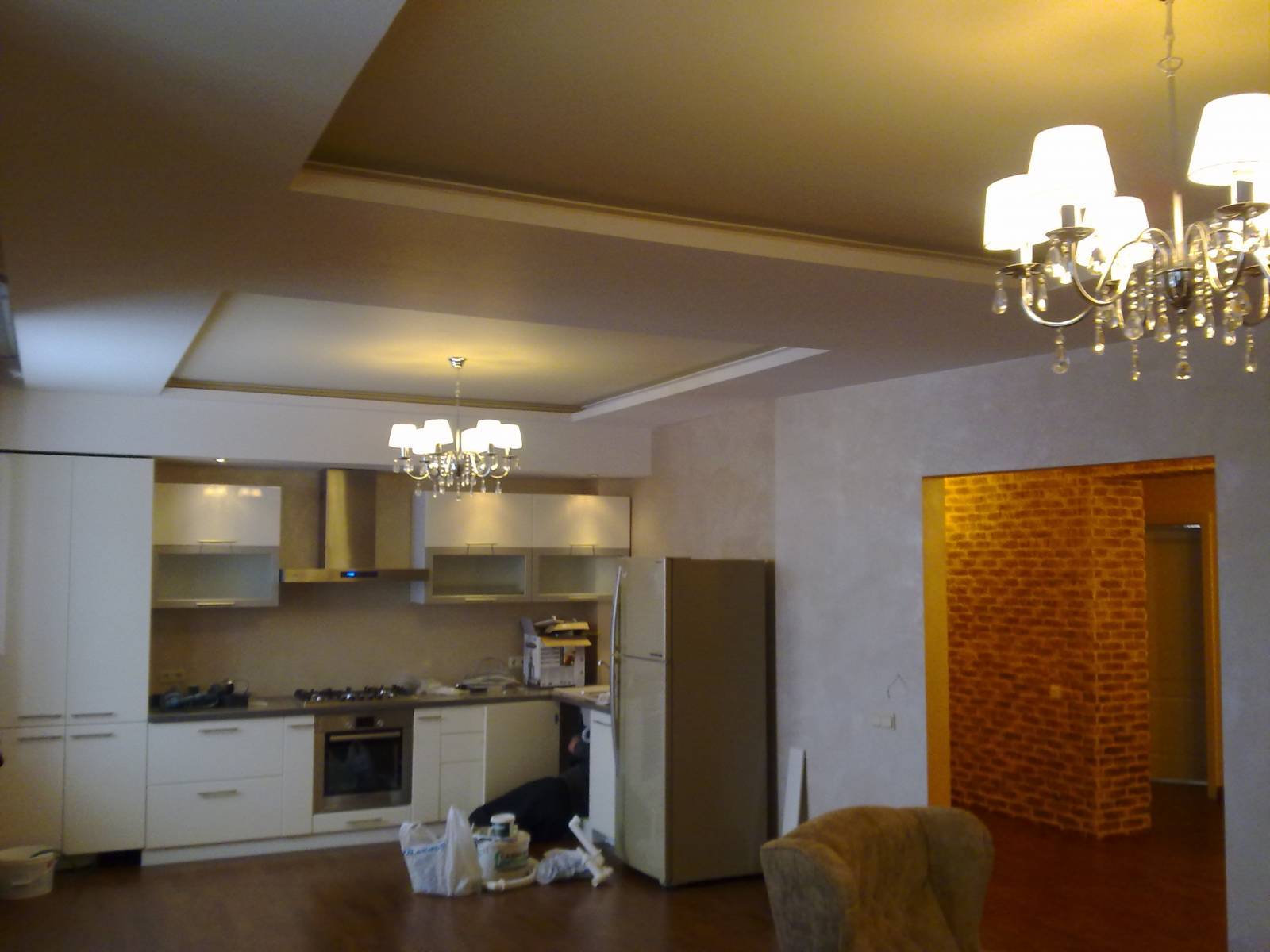 - Натяжные потолки в кухонной и обычные — в остальном помещении.