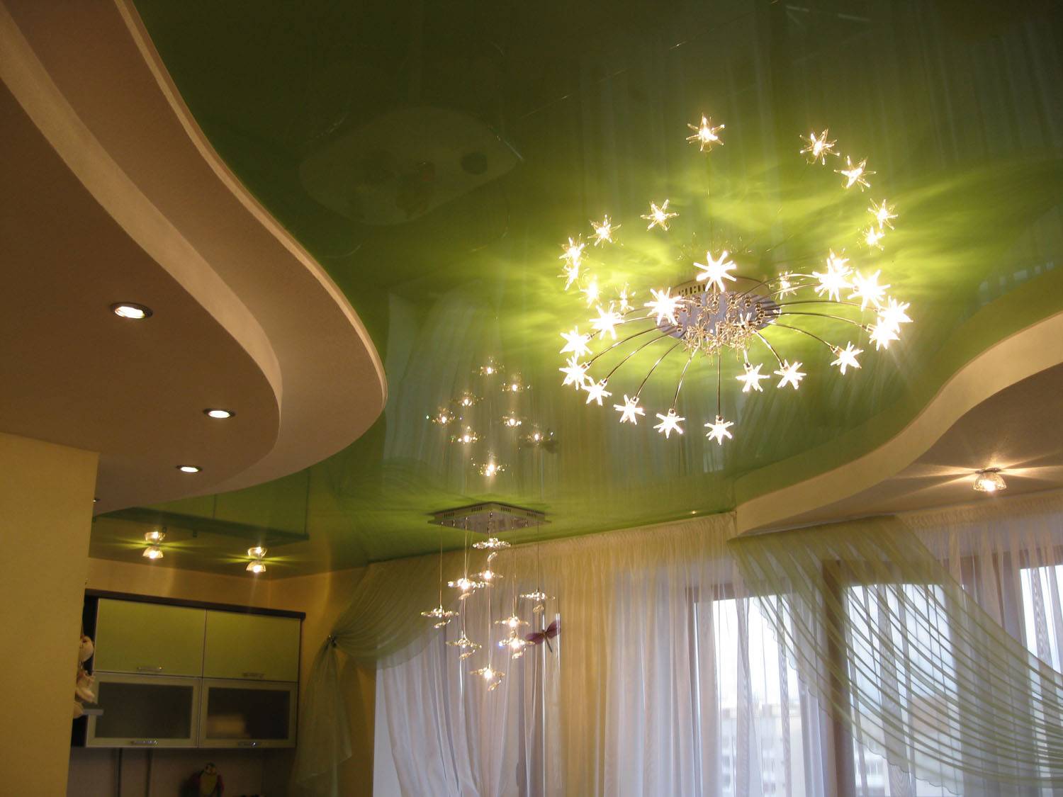 Пленка для натяжного потолка может быть глянцевой, матовой и сатиновой — она не имеет таких отражающих свойств, как первая, но обладает привлекательным легким блеском. Глянцевая поверхность подходит для зрительного увеличения пространства, причем в таком случае подойдут даже темные оттенки. Матовый потолок имеет обратный эффект — он не создает ощущения продолжения пространства, а, напротив, четко ограничивает его. Сатиновый блеск — компромисс для помещений, в которых нет необходимости ни “поднимать”, ни “занижать” потолок. При выборе материала для многоуровневого или двухцветного потолка в кухне, совмещенной с гостиной, не стоит выбирать разные фактуры, это может создать эффект небрежного интерьера.