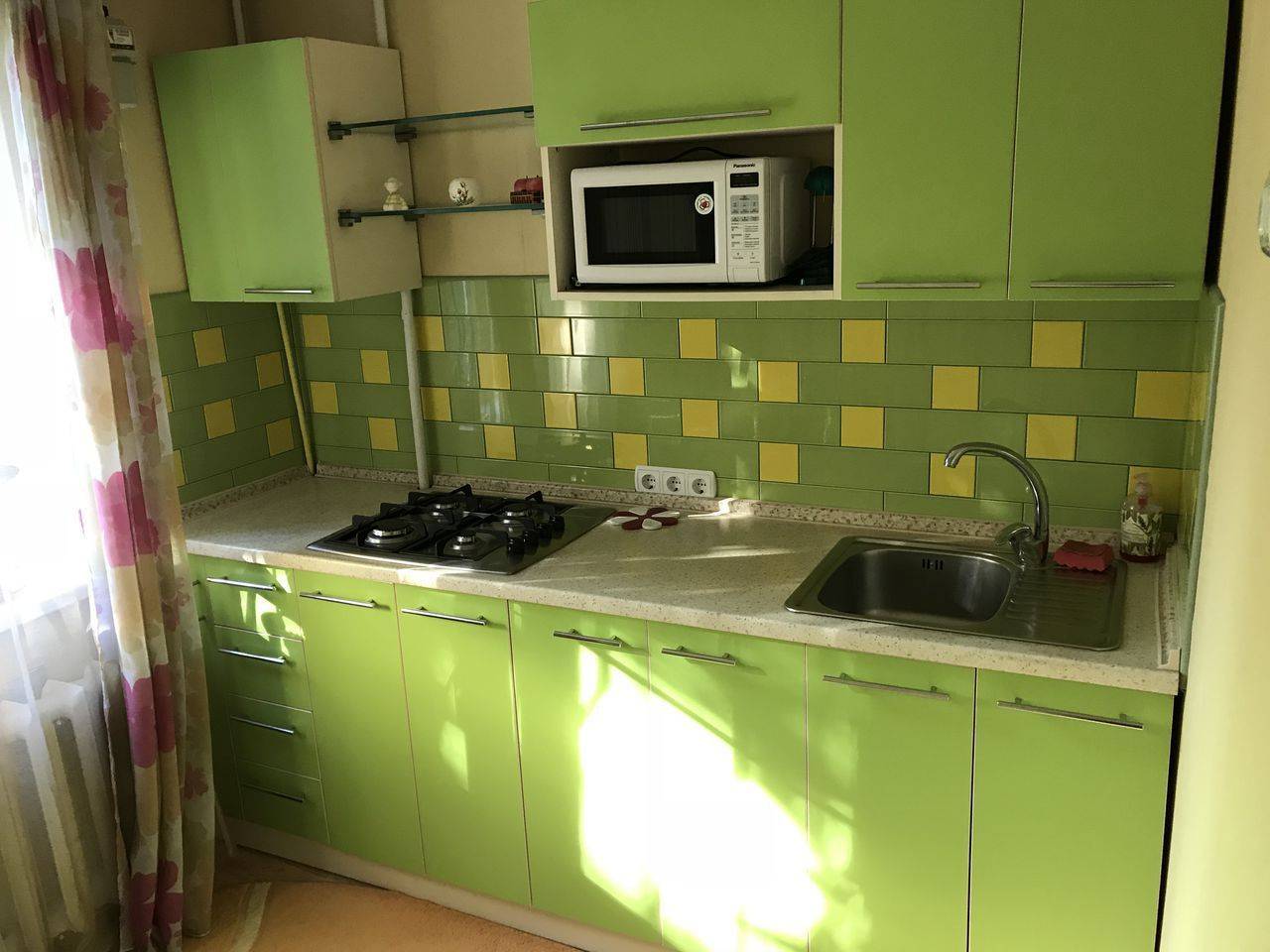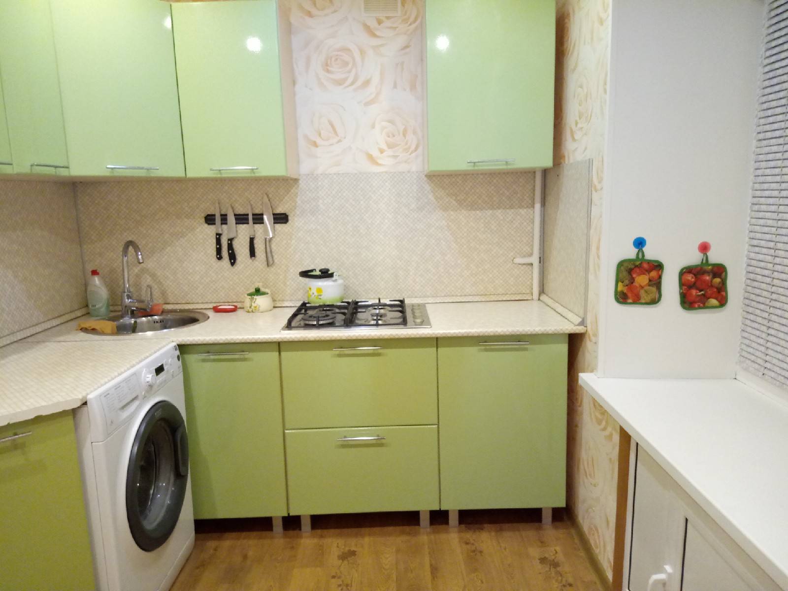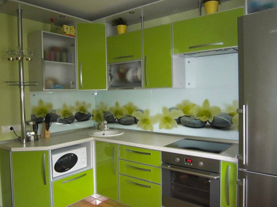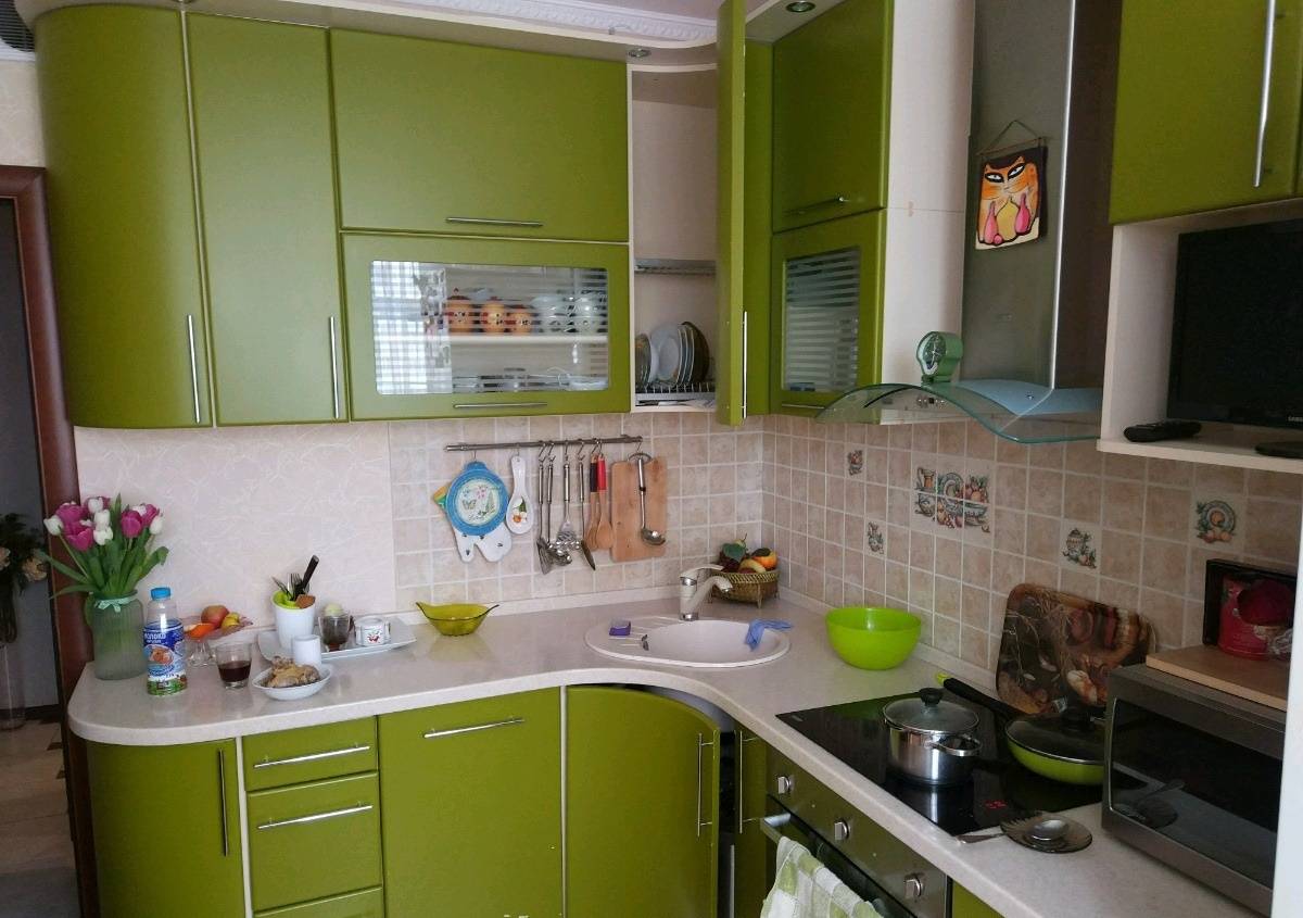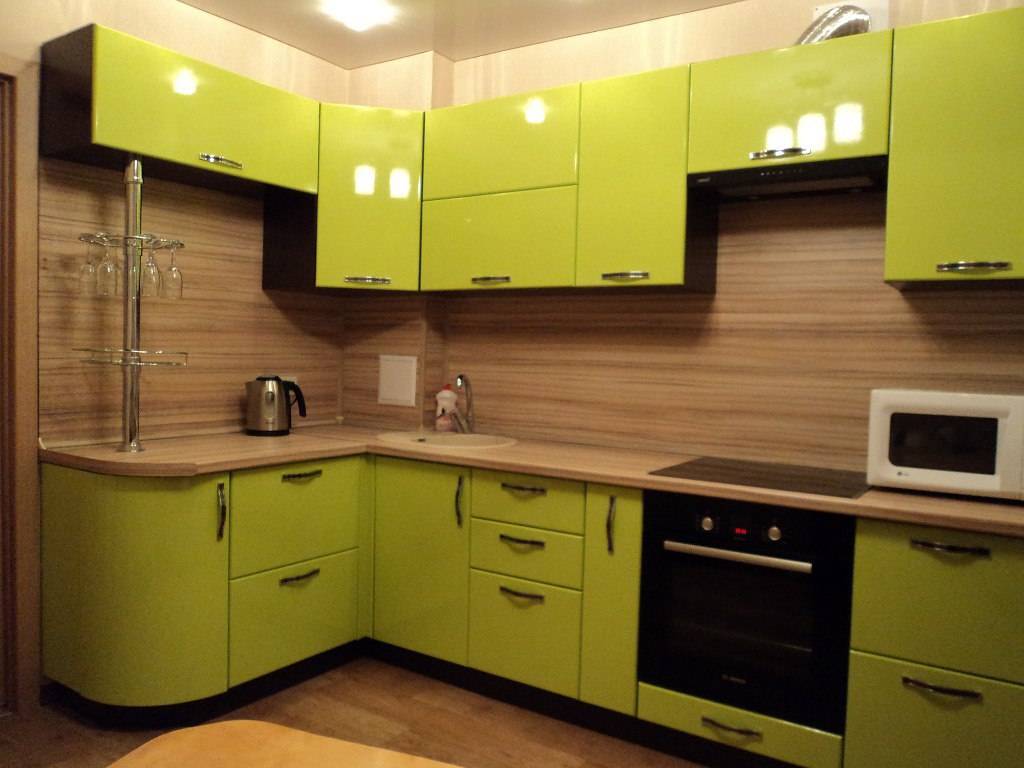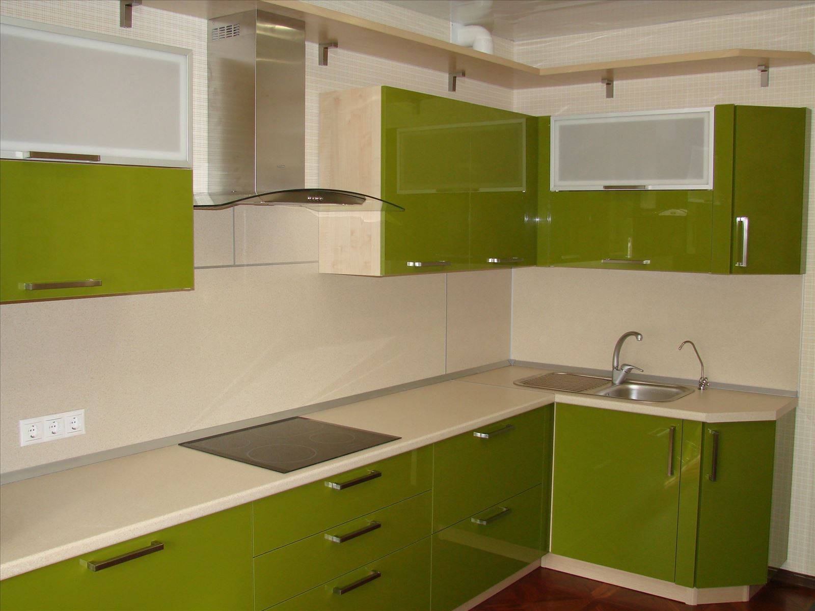 Выбирая такую мебель для кухни, можно немного поиграть с цветовой палитрой. Интересно будет выглядеть гарнитур с фасадами оливковых оттенков, сочетающимися с кухонным фартуком желтого цвета и светлыми столешницами.