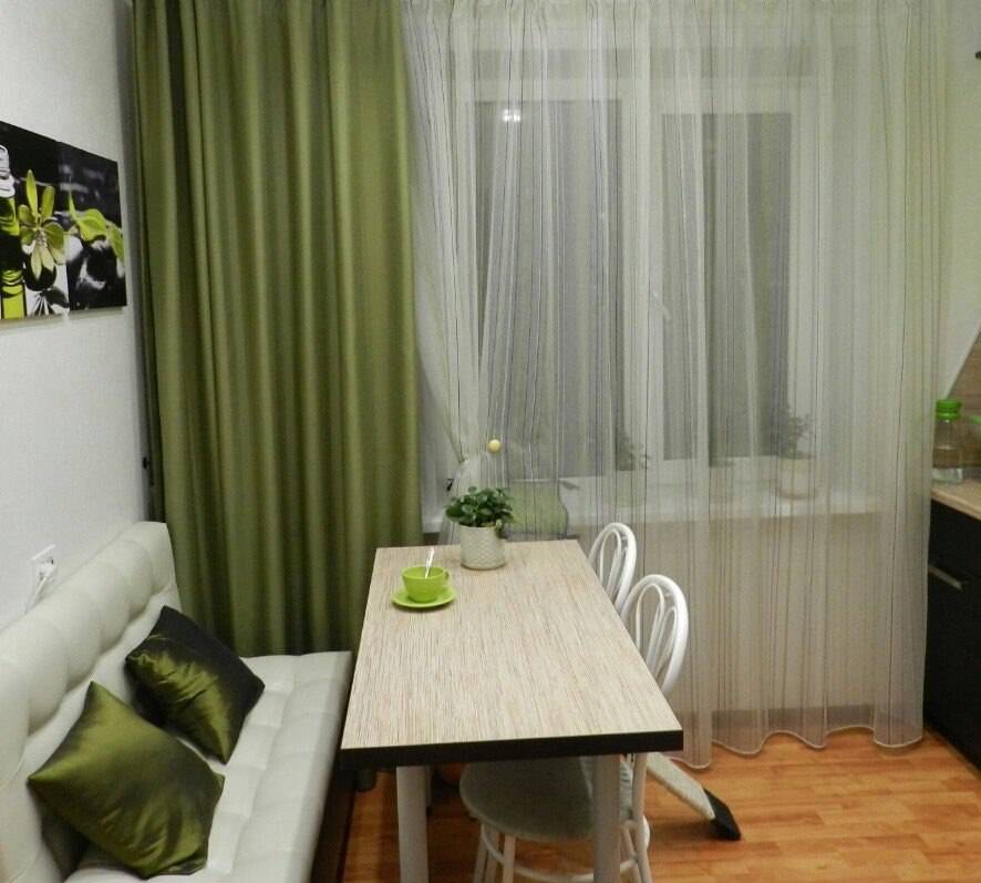 Легкая тюль наполнит комнату зеленью в лучах солнца. При необычном крое оттенки будут играть на свету от свето-бежевого до темно-зеленого. Дополнением могут быть портьеры из плотной ткани перекликающиеся по цвету с другими предметами комнаты.