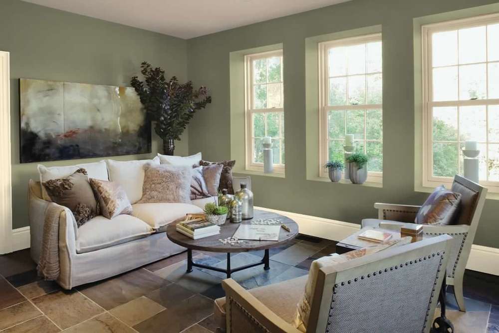 Оливковый цвет сдержанного оттенка будет соответствовать гостиной в стиле классического направления или кантри. Плавные линии предметов мебели подчеркнут изящность комнаты.