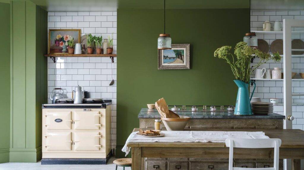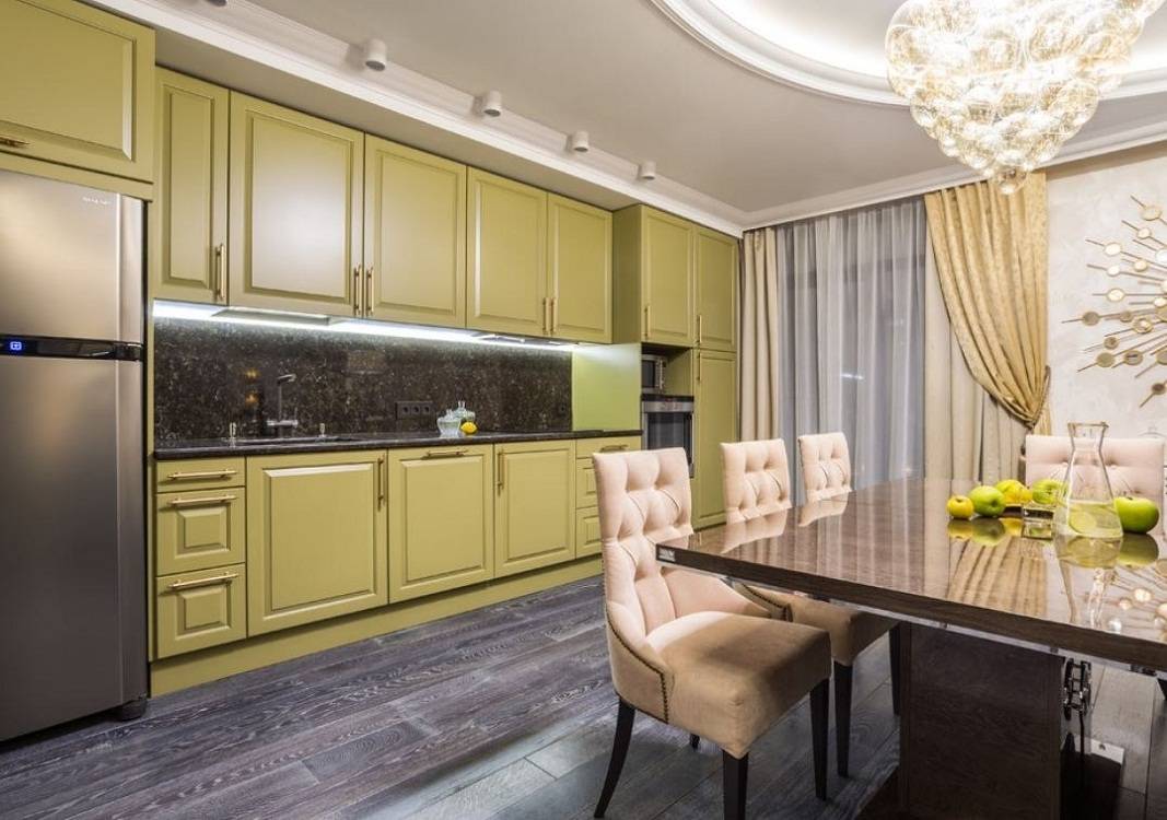 В интерьере кухни цвет может присутствовать в отделке или мебели. Оформление стен в спокойный оливковый станет базой для классической кухни.