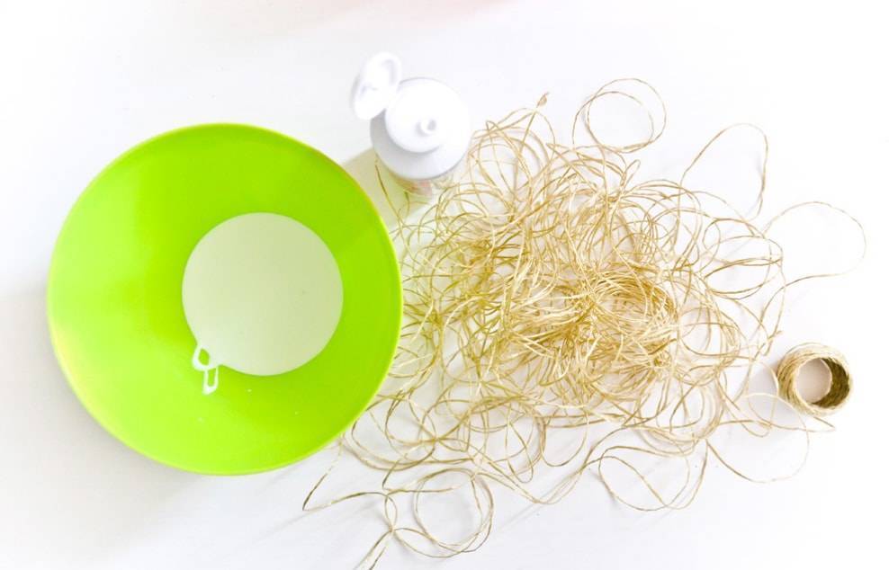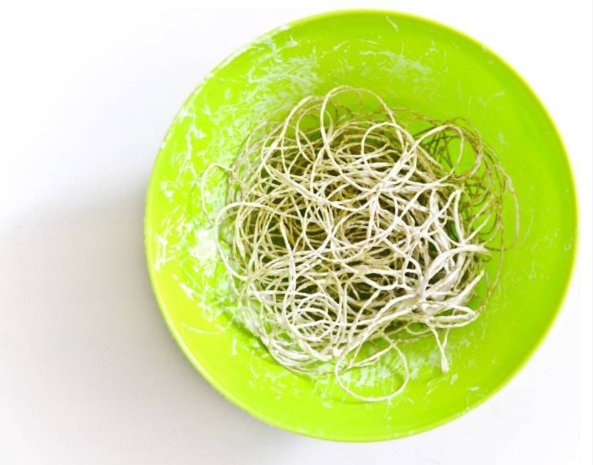 Отрезаем длинный кусок веревки и помещаем ее в миску с клеем.