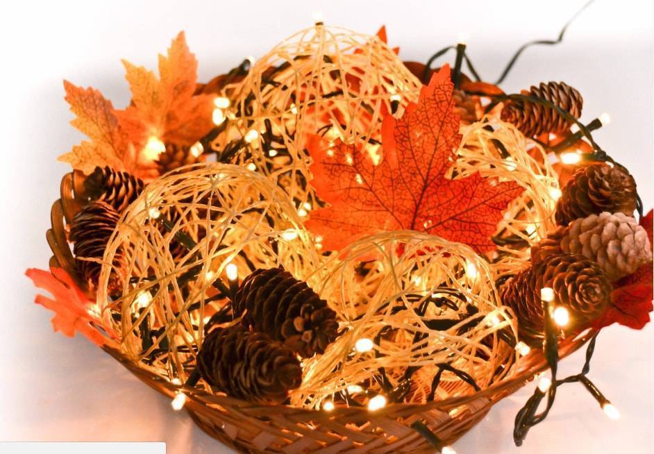 Собираем композицию в корзинку, добавляя шишки, листья и шарики с гирляндой.