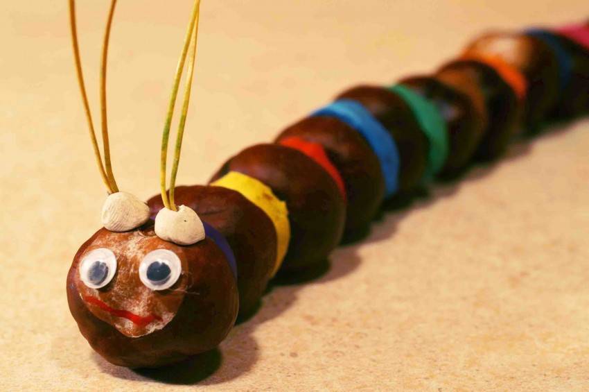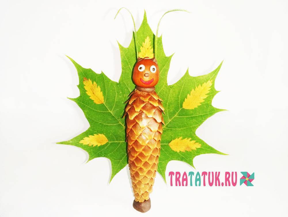 Дополнить композицию можно гусеницей из плодов дерева «Сафора» и стрекозой. Для этого ворсистую палочку сгибаем пополам, перекручиваем, приклеиваем крылышки из «вертолетиков» и шапочку от желудя с большими глазами из пластилина.