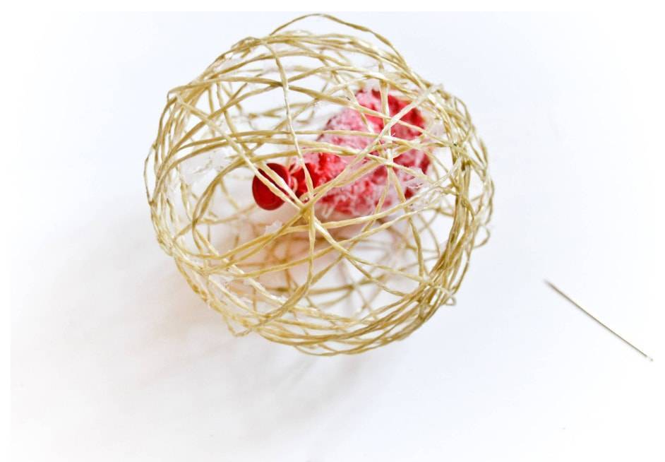 Когда клей высох, аккуратно протыкаем шарик иголкой и вынимаем его.