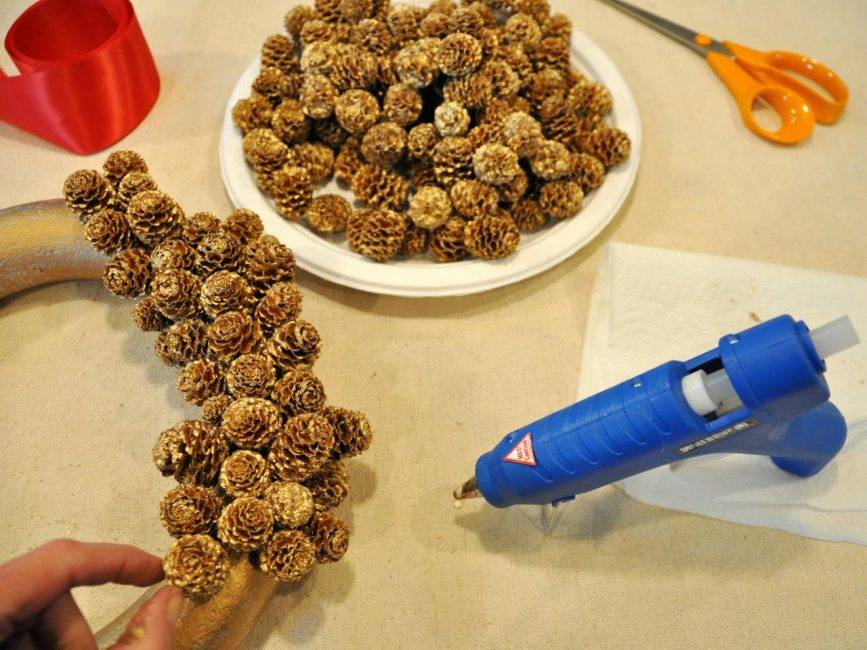 Чтобы сделать венок из шишек, сначала необходимо сделать круглую основу. Если есть желание, её можно сделать своими руками или купить подходящий предмет в магазине. Также можно поискать дома что-то напоминающее круг, подойдет абсолютно любой предмет.