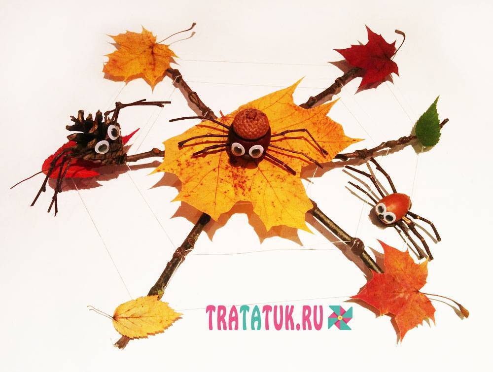В центр паутины сажаем паучка на клей и украшаем листьями.