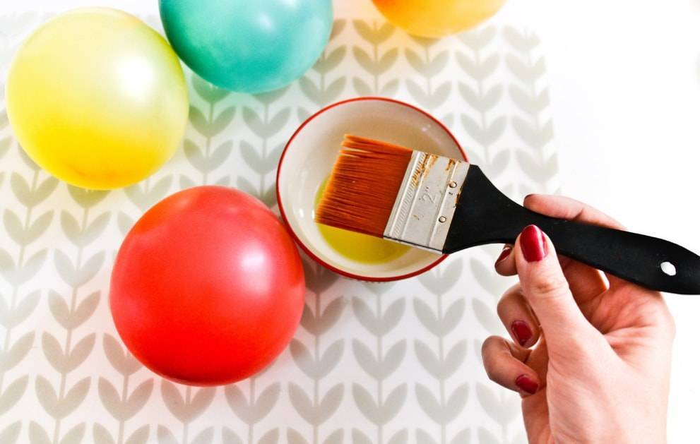 В миску наливаем немного масла. С помощью кисти наносим его на воздушные шарики, чтобы к ним не слишком прилипала нить.