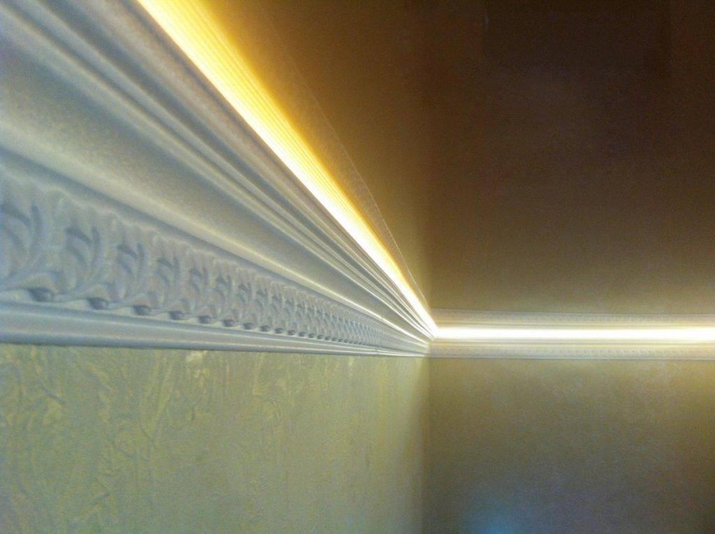 Монтаж светодиодной ленты по периметру потолка. Здесь главное сила освещенности комнаты. Яркий свет будет мешать другим домочадцам.