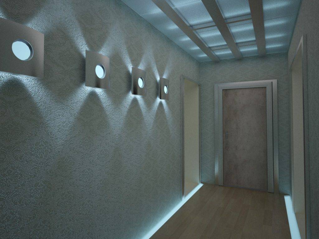 Но если коридор отделан гипсокартоном, то светильники можно встроить в стены. Отдельные светоточки располагают по прямой или в виде какой-либо фигуры. При этом в зависимости от дизайна лампы могут быть одноцветными или разноцветными.
