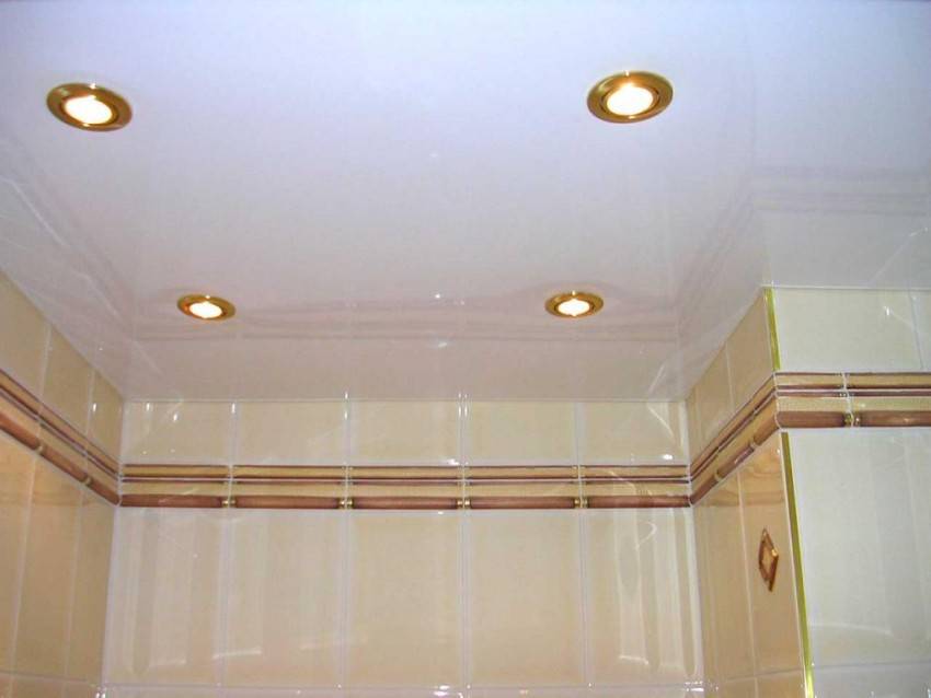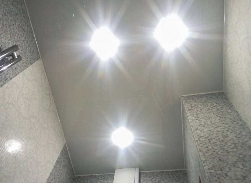Если натяжной потолок в ванной глянцевый, учтите, что свет ламп будет отражаться в его поверхности. Выбирайте меньшее количество ламп – свет и так будет ярким, а вы сэкономите электроэнергию.