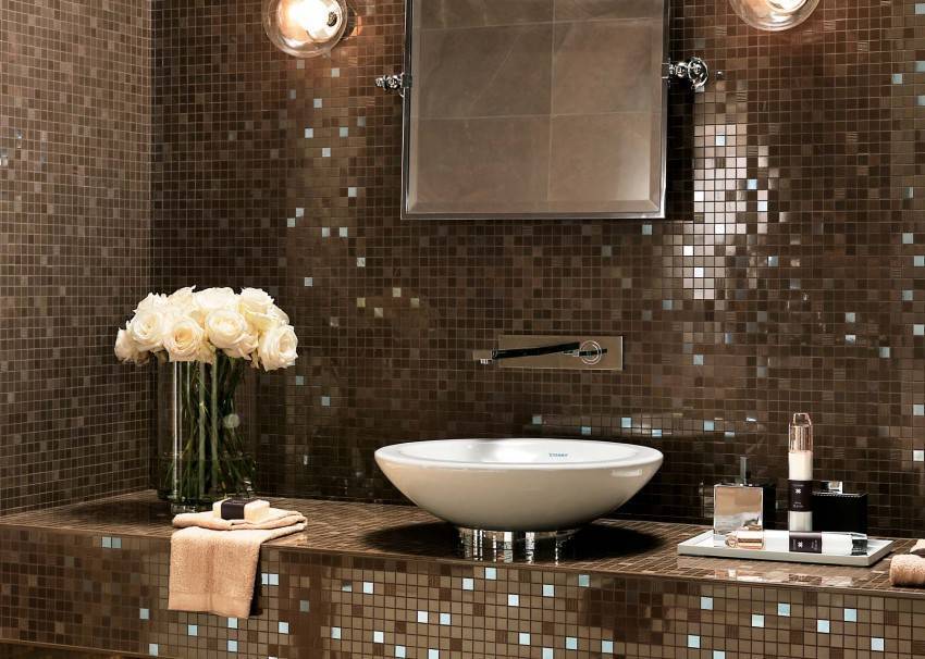 Зеркальную плитку сочетают с разными видами отделочных материалов, однако лучше всего она смотрится с керамической плиткой.
