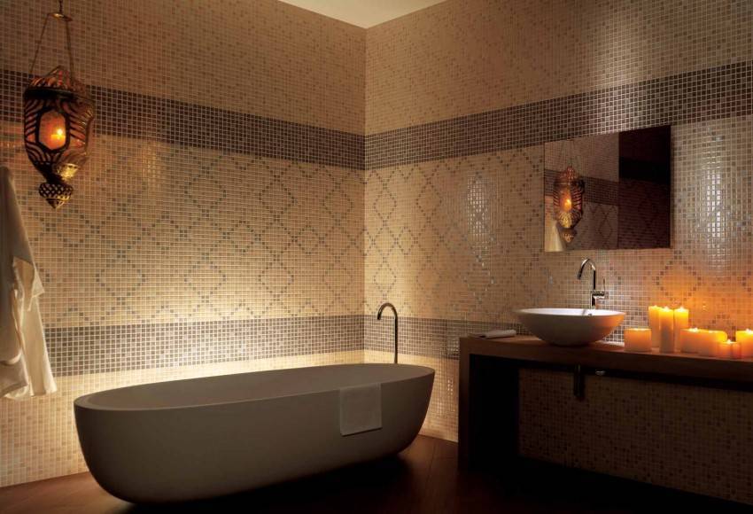 Интересно будет смотреться мозаика на стенах в этническом стиле. Восточные и африканские узоры станут модным акцентом в вашем декоре. Мозаичные плитки из мелких квадратов с глянцевым блеском добавят гламура и шика.