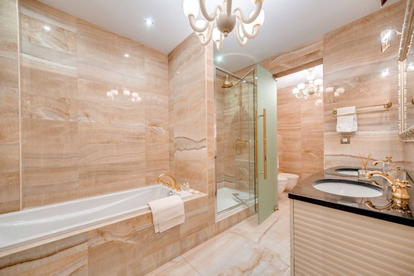 Дорогой и изысканный вариант — использование для отделки ванны натуральный камень: мрамор, сланец, оникс. Он будет требовать более тщательного ухода, хотя современные пропитки не позволяют влаге проникать внутрь такого материала.