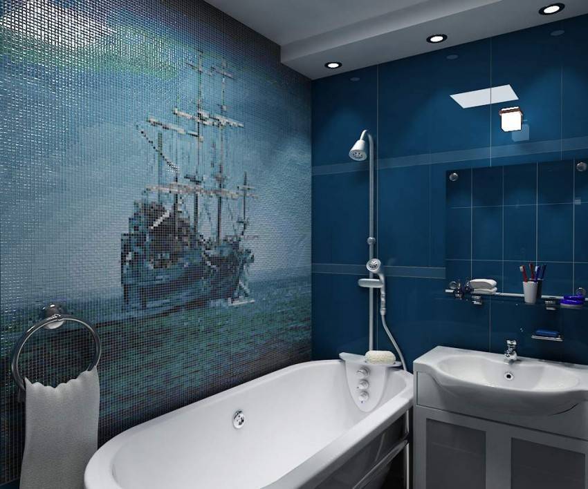 В интерьере ванной комнаты оригинально смотрится и мозаика, которая поможет визуально увеличить помещение. В дополнение к плитке или камню мозаика создаст прекрасное сочетание функциональности и красоты. Можно приобрести уже готовые полотна или заказать целое панно.