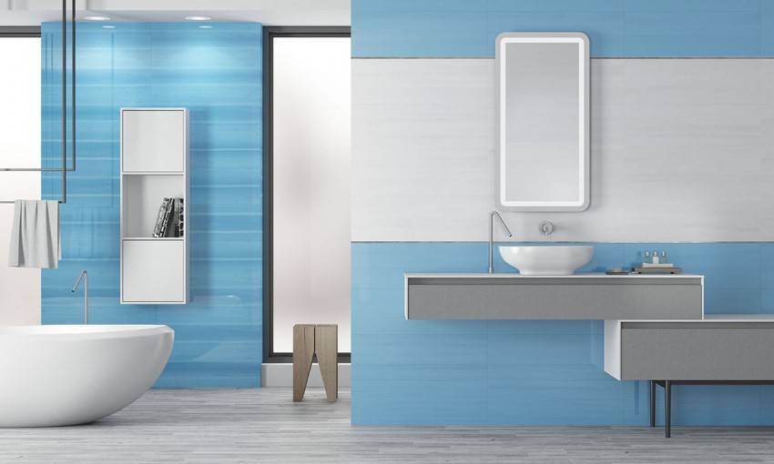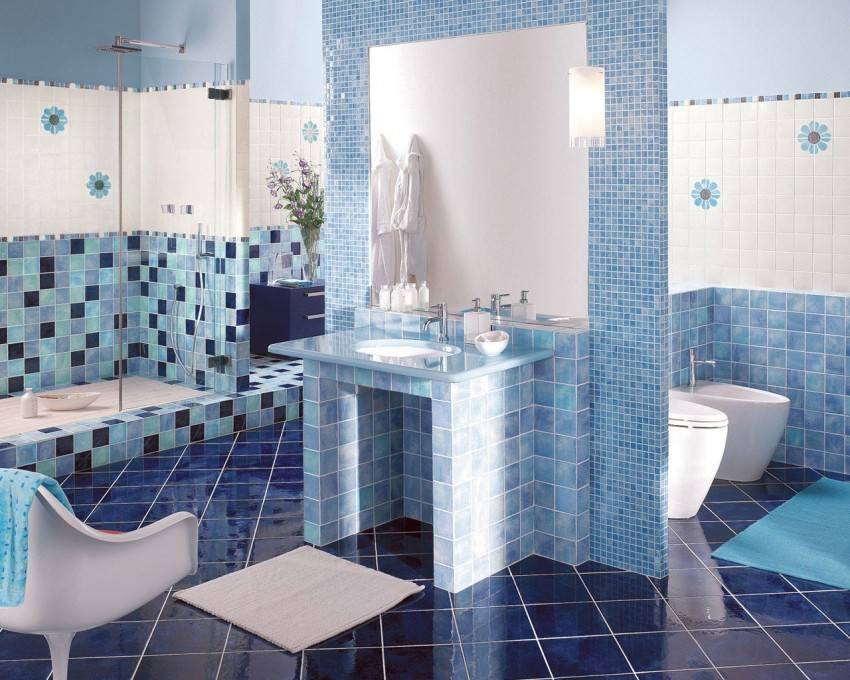 Синий цвет напоминает воду, поэтому он всегда находил место в отделке ванных и туалетов. Сейчас в моде сложные синие тона: цвет морской воды, бирюзовый, ультрамариновый.