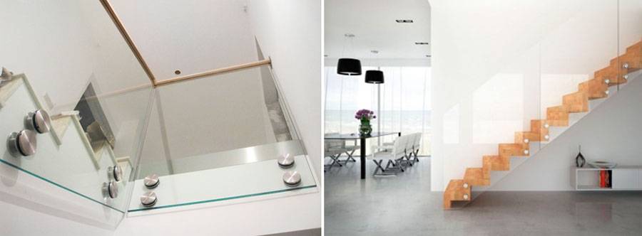 - Стеклянные. Они стильные, но маркие – на поверхности остаются следы от рук. Изготовленные полностью из стекла конструкции часто лишены поручней. Это лучший выбор для офиса.