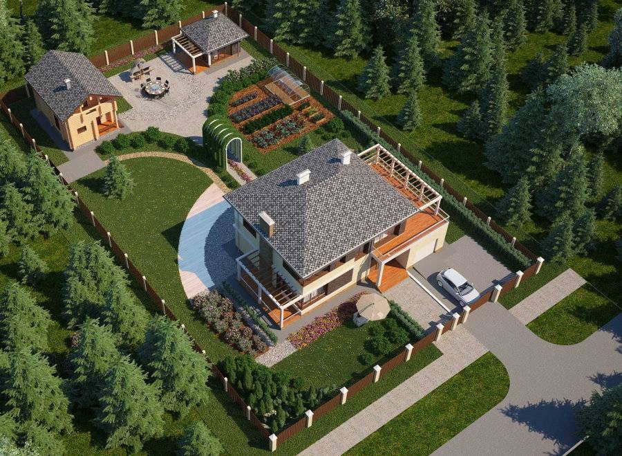 Дача или частный дом обычно размещаются ближе к фасадной части территории, оставляя участок для заднего двора, скрытого от глаз