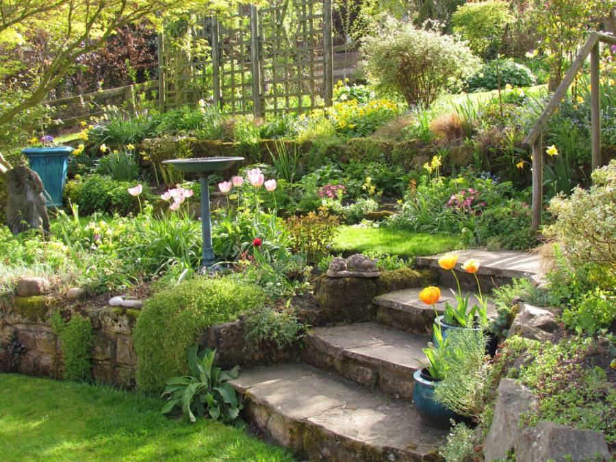 Разноуровневые террасированные участки сада с растениями у дома позволяют естественным образом разграничить клумбы с растениями и цветники. Наличие лестницы в саду позволяет обыграть на участке со склоном парадный классически стиль дизайна. А возможность обустройства небольшого искусственного водоема подходит для оформления ландшафтного дизайна сада на склоне в японском стиле.
