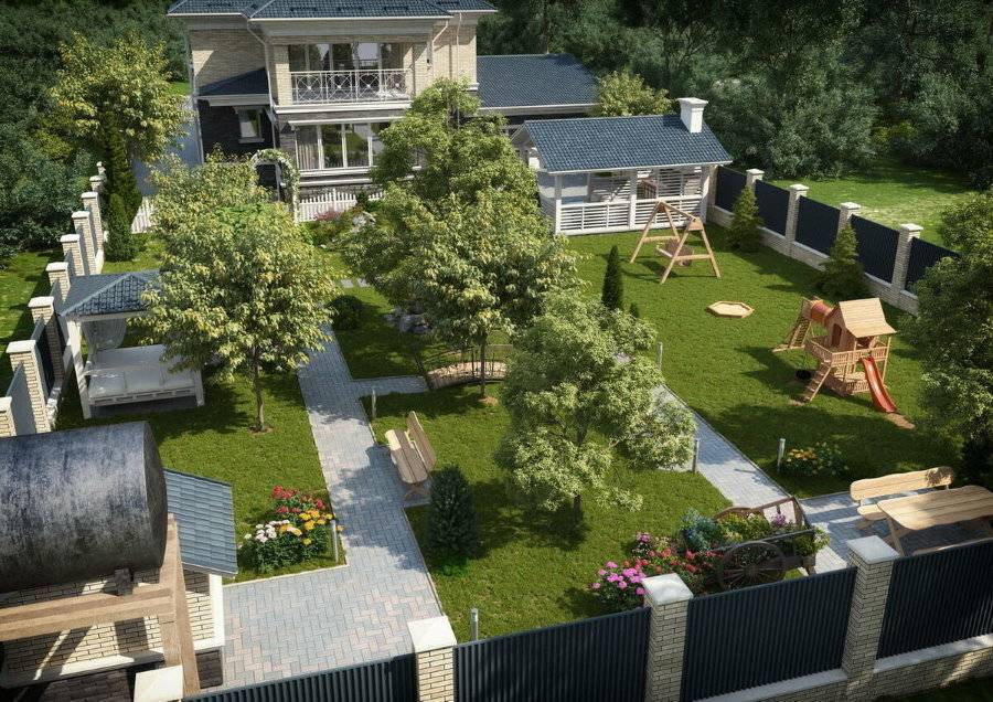 Эти детали учитывают на начальном этапе. Проектировщики советуют составить сначала требования к участку. Список того, что владелец хочет видеть во дворе. Озвученные предпочтения позволят составить точный список объектов. Дополнительно можно разместить турники, сделать дорожку для пробежки вокруг территории, внутри участка.