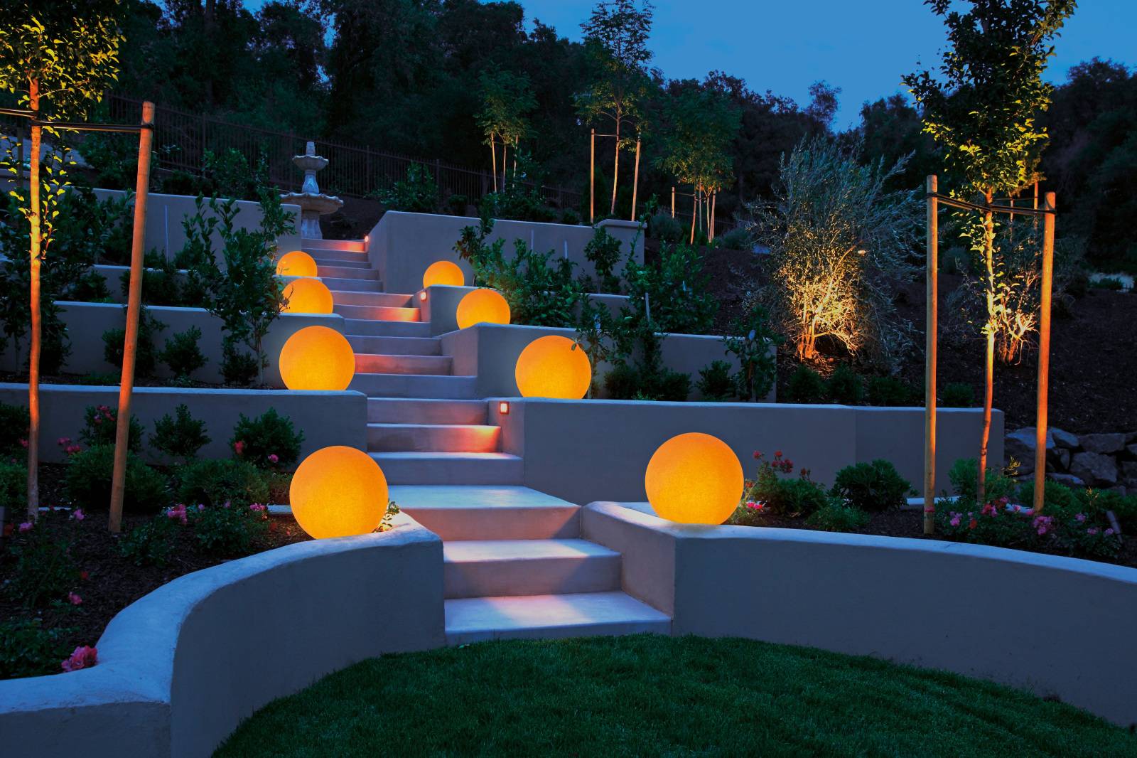 Серпантины подчеркивают крутизну склона, укрепленного подпорными стенками. Ступеньки должны быть удобными и безопасными. Слишком крутую конструкцию рекомендуется дополнить перилами и продумать ночное освещение.