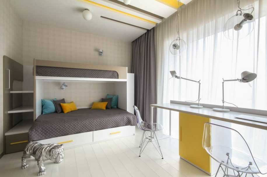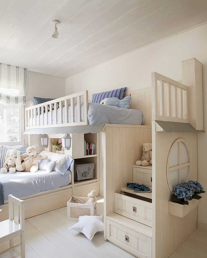 Иногда добавляют коробки для игрушек, турник, книжные стеллажи. Мебель приходится удваивать, особенно, если в ней живет мальчик и девочка. Крупногабаритные вещи разместить порою очень сложно, поэтому можно использовать более функциональную мебель – шкаф-купе, двухъярусную кровать.