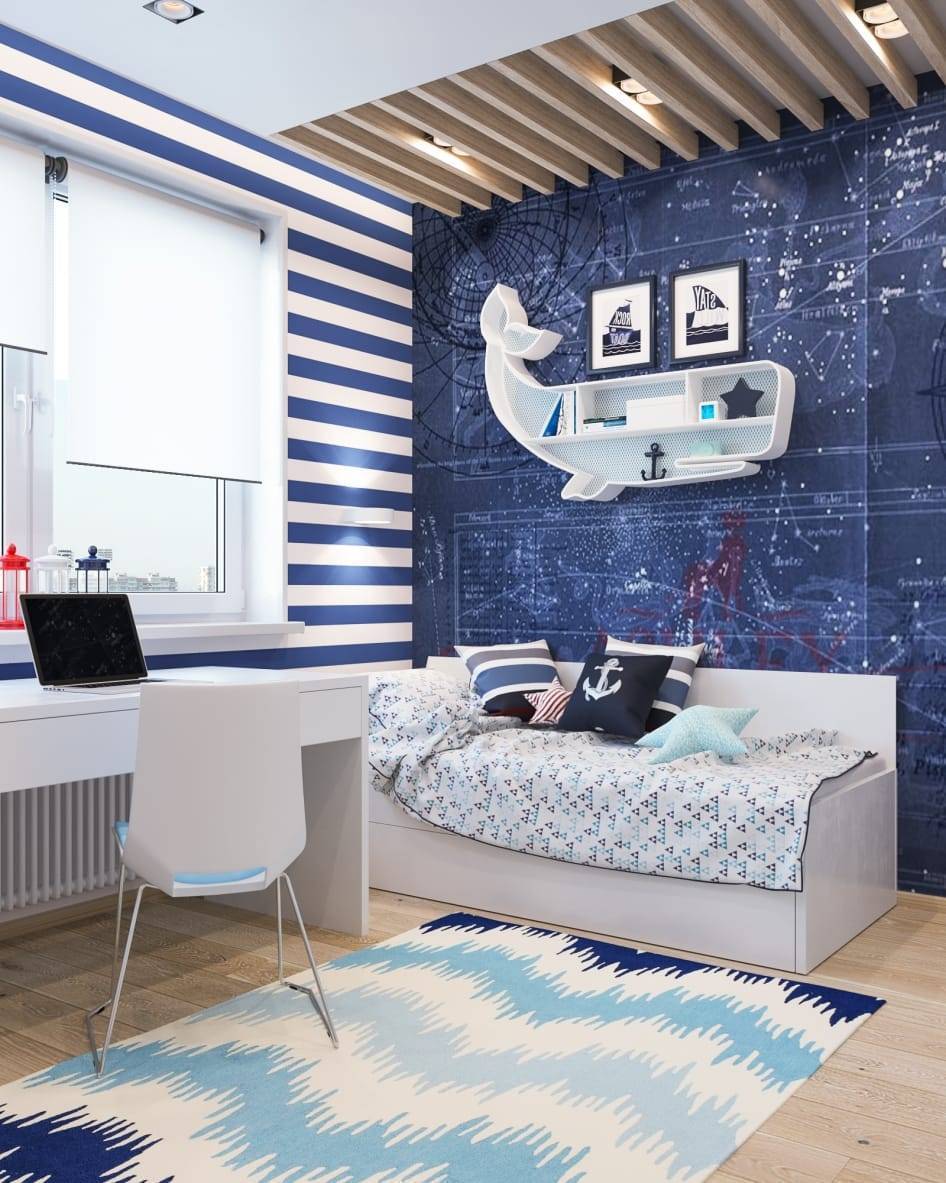 Тёмно-синий оттенок великолепно смотрится в союзе с приглушённым красным цветом в детской мальчиков